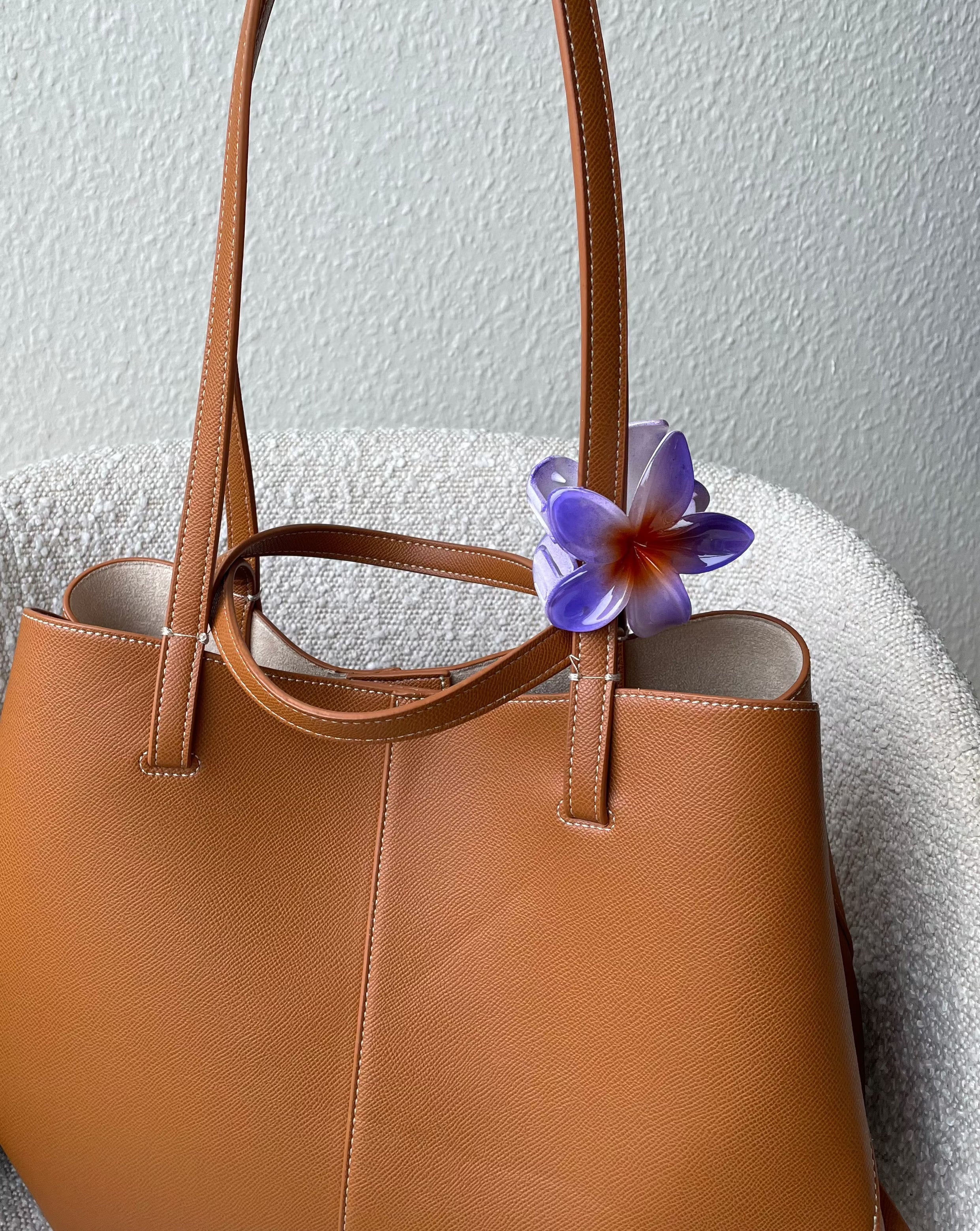 Vores fine og elegante Hawaiiblomst hårklemme er den perfekte accessories til sommeren. Den kan bæres i håret som en hårklemme eller omkring håndtaget på en af vores finde tasker🌸