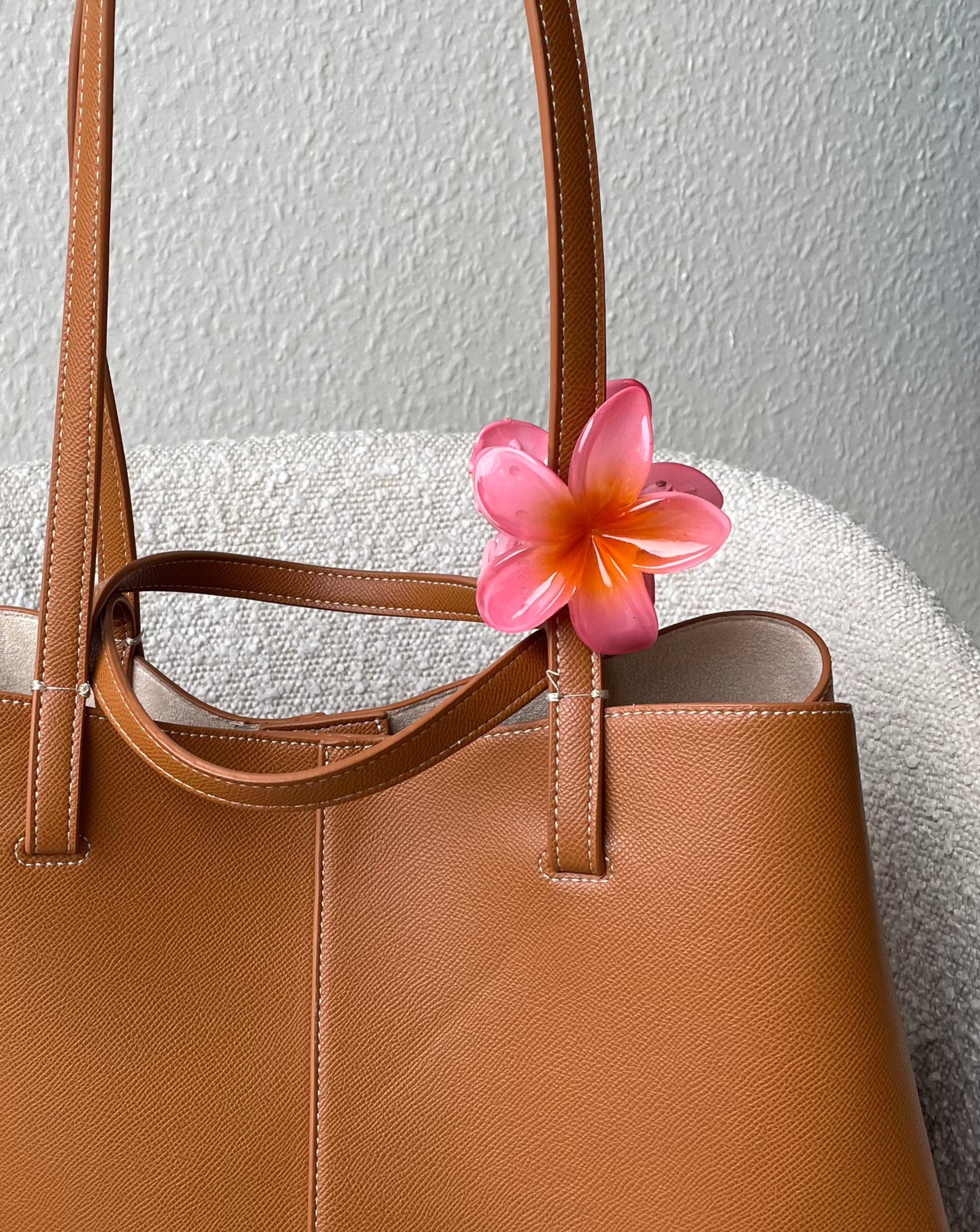 Vores fine og elegante Hawaiiblomst hårklemme er den perfekte accessories til sommeren. Den kan bæres i håret som en hårklemme eller omkring håndtaget på en af vores finde tasker🌸