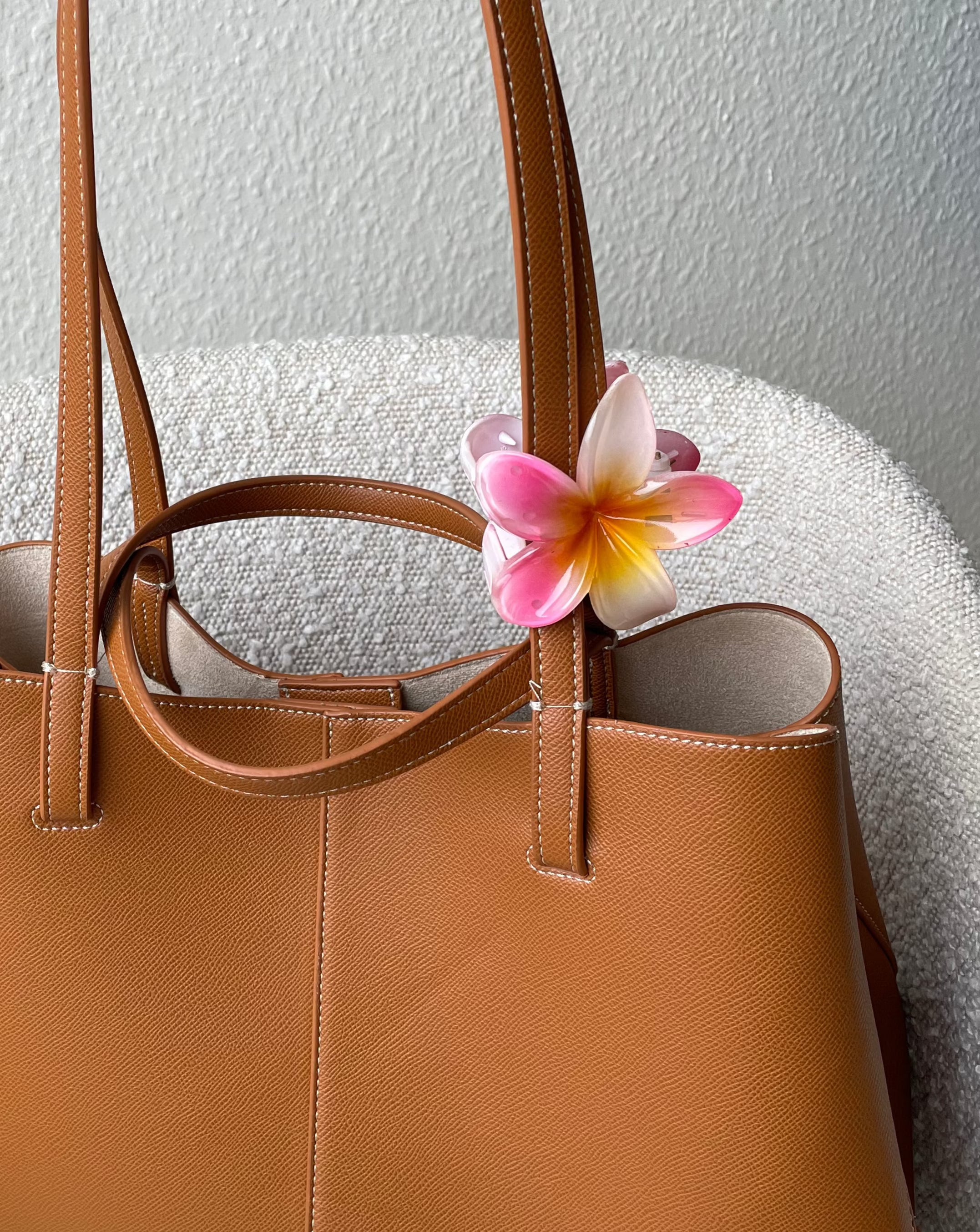 Vores fine og elegante Hawaiiblomst hårklemme er den perfekte accessories til sommeren. Den kan bæres i håret som en hårklemme eller omkring håndtaget på en af vores finde tasker🌸