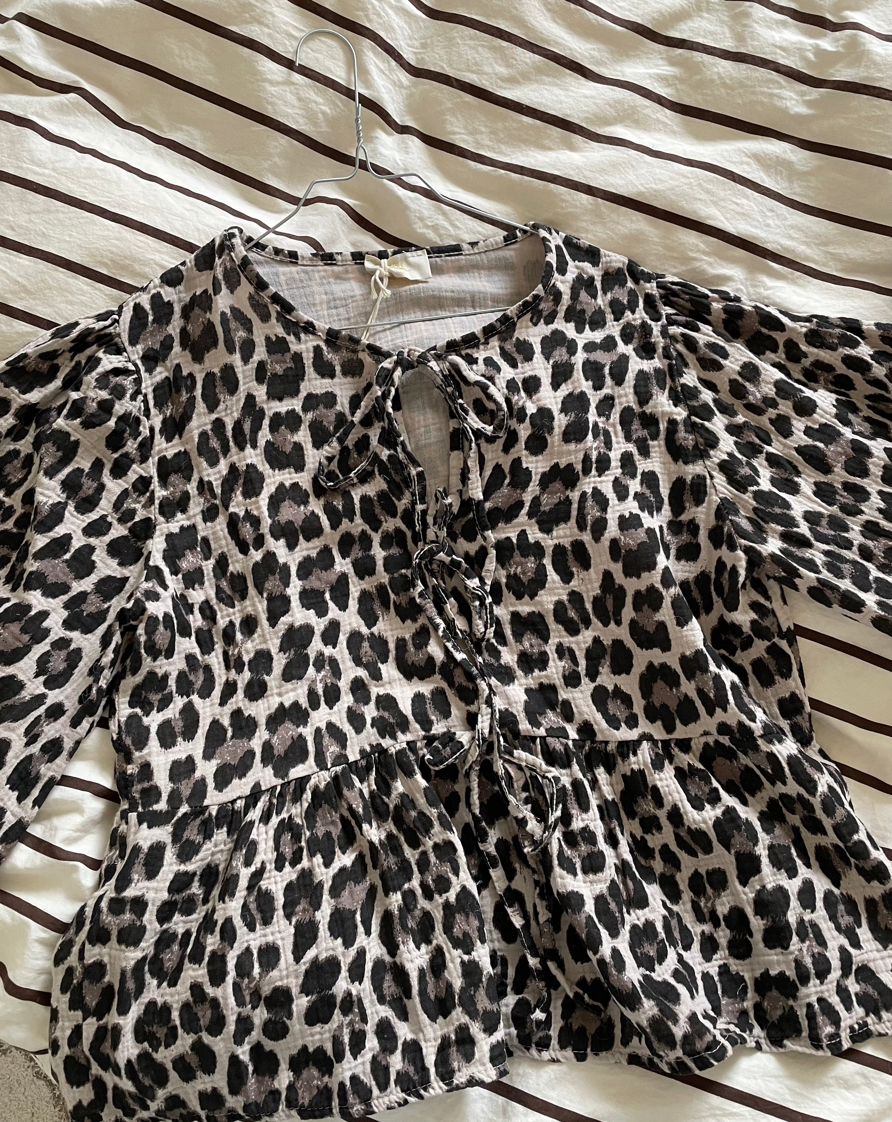 Vores fine Leopard Bluse er en fin bluse i leopard print. Blusen har lange ærmer og tre sløjfer foran, som kan bindes op☀️🐆 Blusen passer perfekt med vores Leopard Nederdel