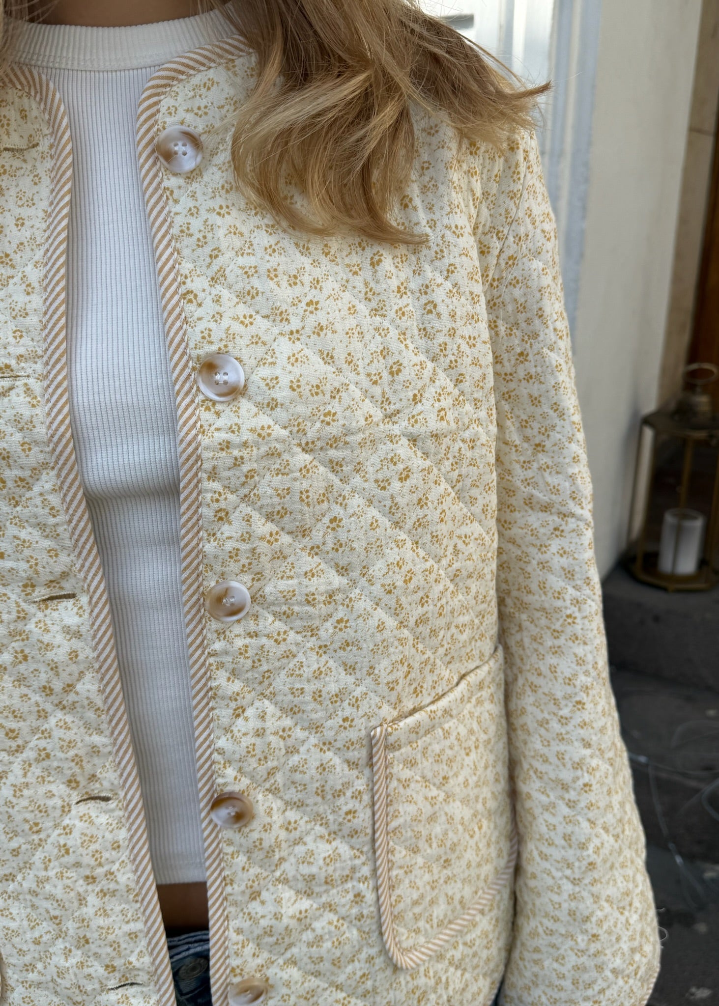 Vores Vatteret Jakke er den perfekte overgangsjakke til sæsonernes skift. Den er designet i et elegant quiltet mønster. Jakken har et klassisk snit med knaplukning foran og to praktiske frontlommer, som giver både funktionalitet og et afslappet udtryk🩷