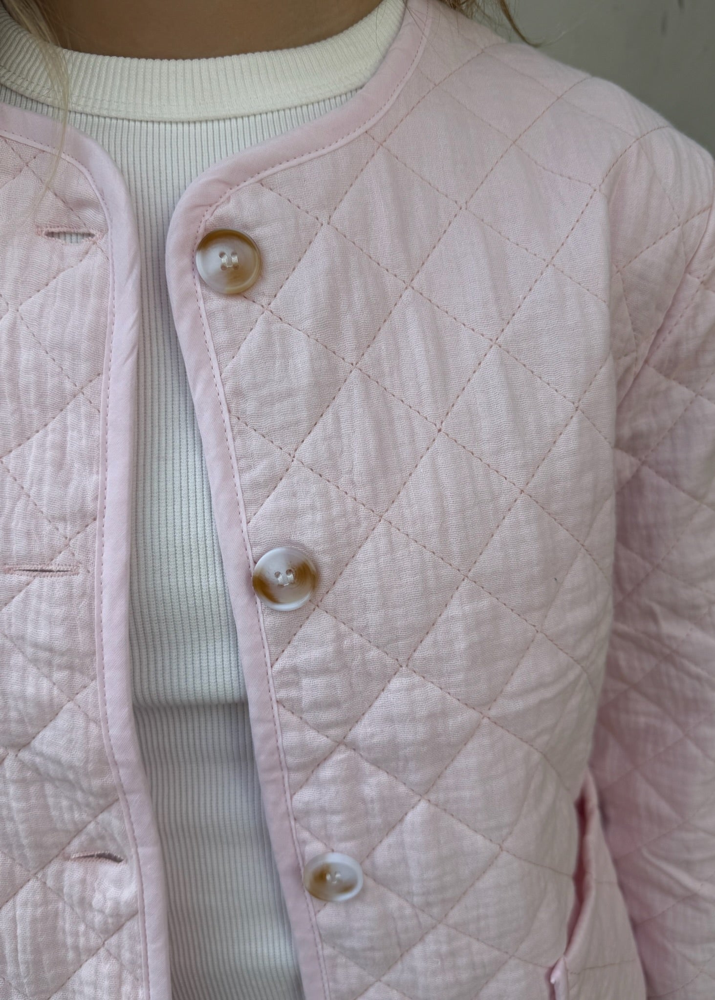 Vores Vatteret Jakke er den perfekte overgangsjakke til sæsonernes skift. Den er designet i et elegant quiltet mønster. Jakken har et klassisk snit med knaplukning foran og to praktiske frontlommer, som giver både funktionalitet og et afslappet udtryk🩷