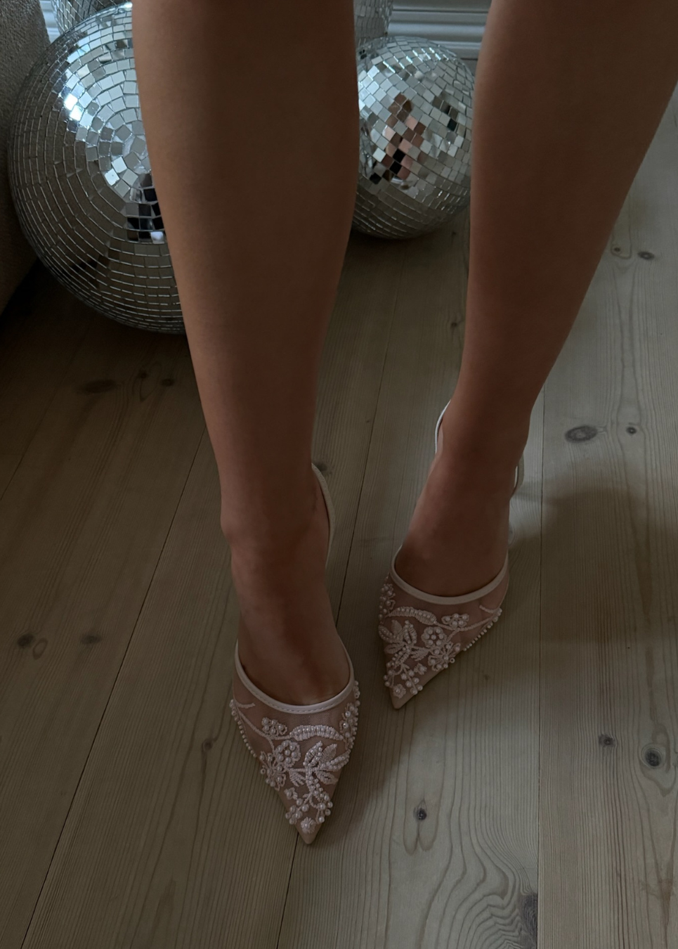 Blonde Slingback Pumps er festlige og feminine slingbacks med spids snude og elegant kitten heel. Skoen er dækket af små glitrende pailletter, der fanger lyset smukt og tilfører ethvert outfit et glamourøst touch. Den slanke rem bagpå sikrer et behageligt fit, mens den sølvfarvede finish gør dem perfekte til særlige anledninger🥂✨