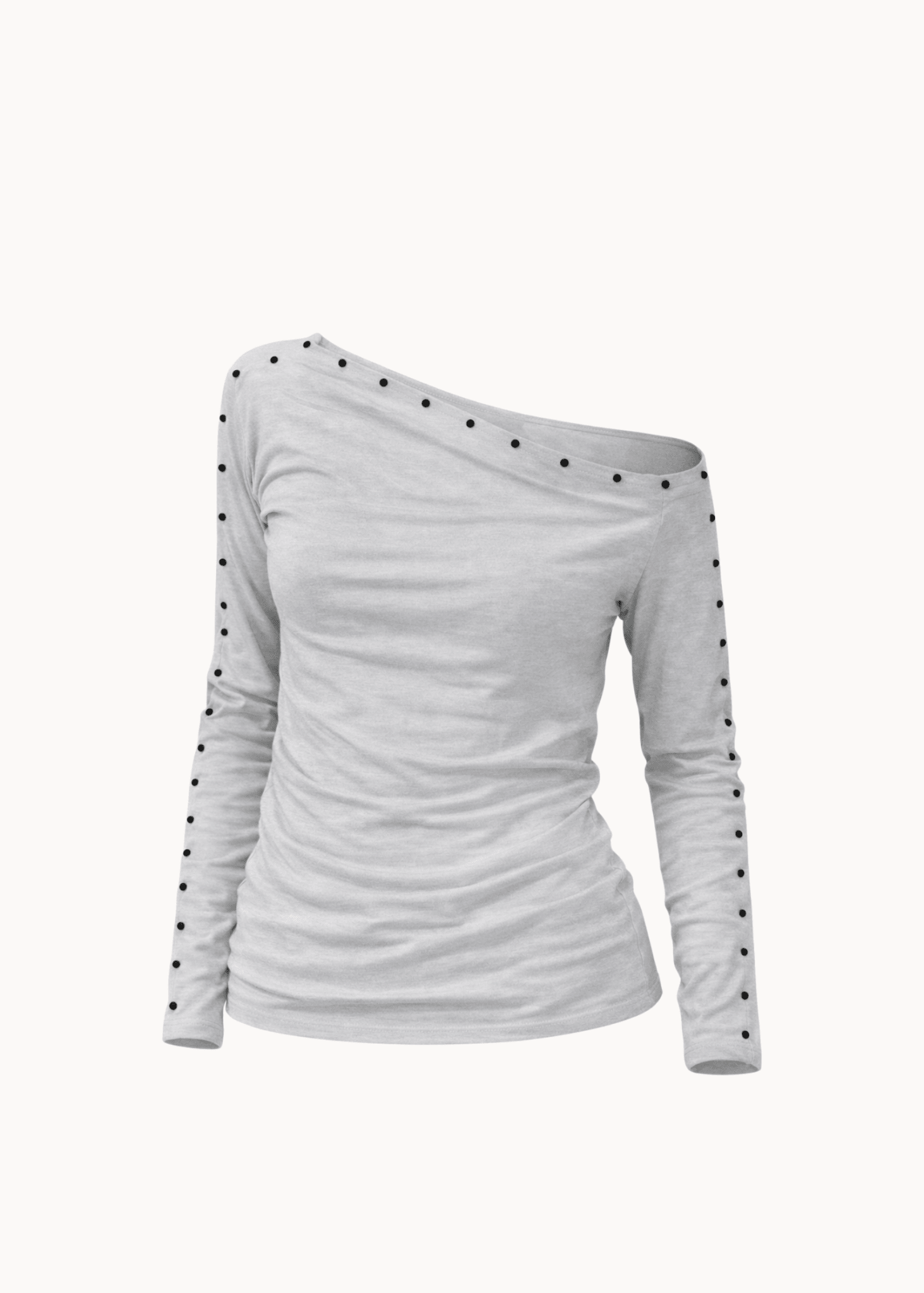 Nova Blusen med Nitter er en elegant og feminin off-shoulder bluse med et moderne twist. Blusen er designet i et blødt, strækbart materiale, der smyger sig flatterende om kroppen og skaber en let draperet effekt. Den asymmetriske halsudskæring giver et sofistikeret look, mens de diskrete nitter langs halsudskæringen og ærmerne tilfører et råt og eksklusivt udtryk. De lange ærmer balancerer det feminine snit og gør blusen velegnet både til hverdagsbrug og mere festlige anledninger. Perfekt stylet med jeans, læderbukser eller en nederdel for et stilrent outfit🤍