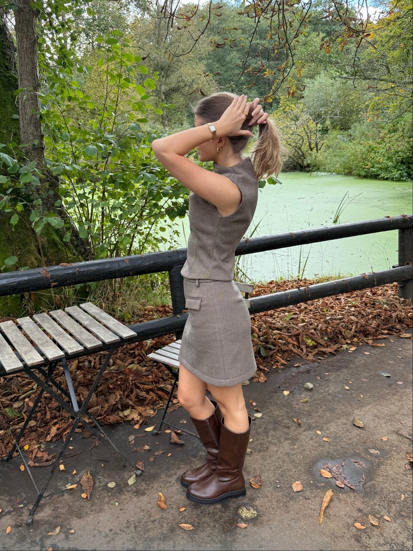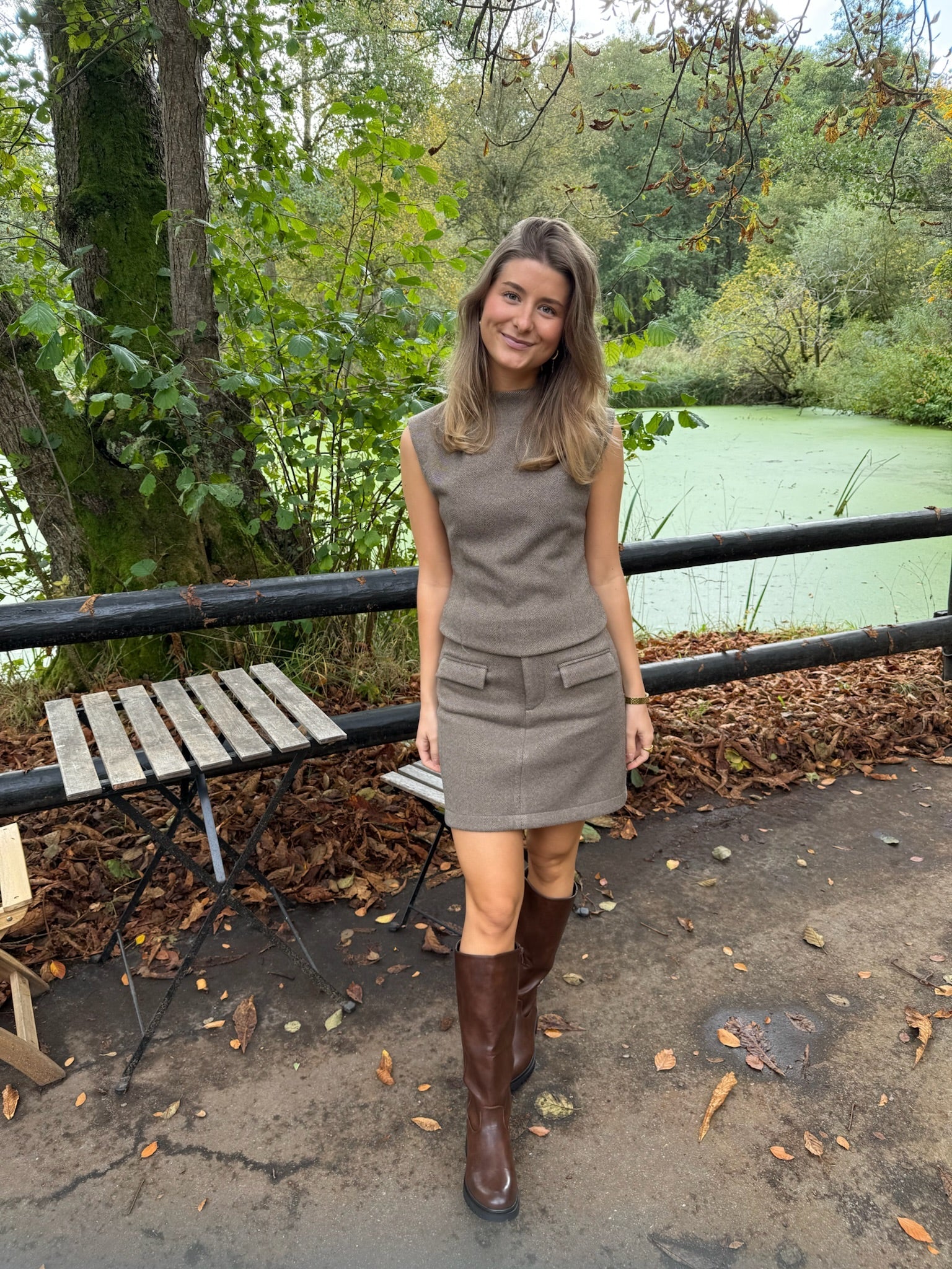 Dette elegante sæt kombinerer en stilren brun nederdel med en feminin, tætsiddende top og skaber et gennemført og sofistikeret look. Nederdelen har en tidløs silhuet, der falder smukt og gør den velegnet til både hverdagsbrug og mere formelle anledninger. Toppen tilfører et eksklusivt og feminint udtryk, som fremhæver figuren og fuldender sættet på en elegant måde.