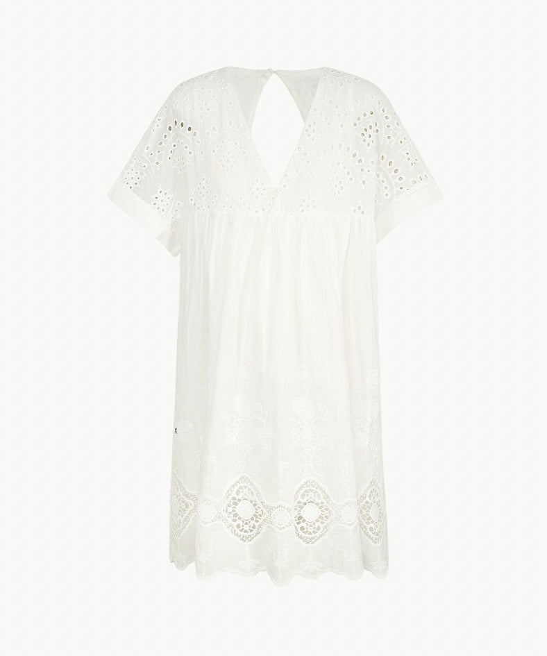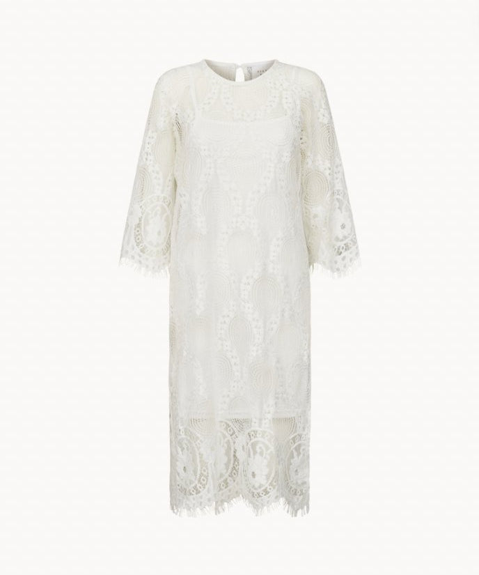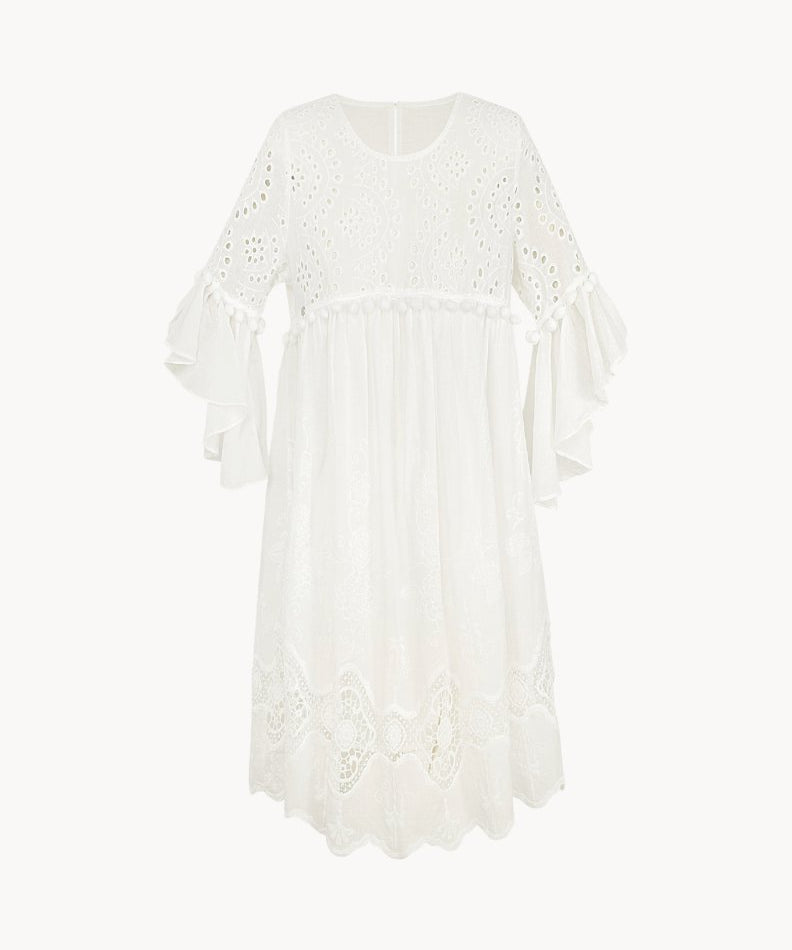Vores fine Hørkjole med frynser er en fin hvid sommerkjole i et let og tyndt materiale. Kjolen har fine frynser på ryggen og ærmerne, der giver kjolen et fint og elegant udtryk. Derudover har kjolen knapper i den nederste del af kjolen.