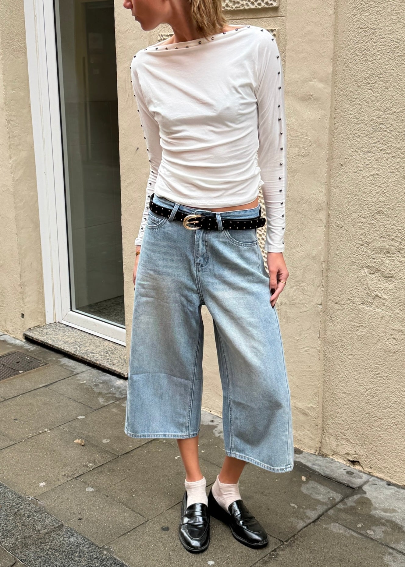 Vores Culotte jeans er designet med en moderne, vid pasform og en cropped længde, der giver et let og afslappet udtryk. Den høje talje og de lige ben skaber en flatterende silhuet, mens den bløde denim sikrer god komfort hele dagen. Et alsidigt design, der nemt kan styles både til hverdag og mere casual anledninger.