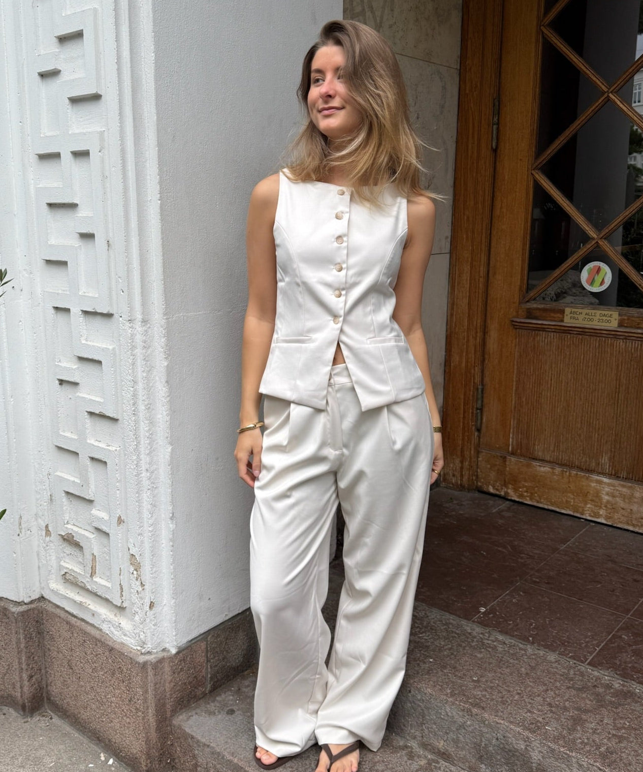 Vores smukke Sira sæt fås med Maxi Nederdelen og Toppen. Nederdelen er lang og har et løst, lige fit. Den har et slids bagpå samt lommer og lukkes med knap og lynlås foran. Toppen har en smuk åben ryg, der bindes bagpå i taljen med et tyndt bindebånd. Taljen kan strammes ind efter behov, hvilket giver mulighed for både et figursyet look eller et mere lige fit. Toppen er ærmeløs og har en lille knap i nakken, der fuldender det elegante design🌟