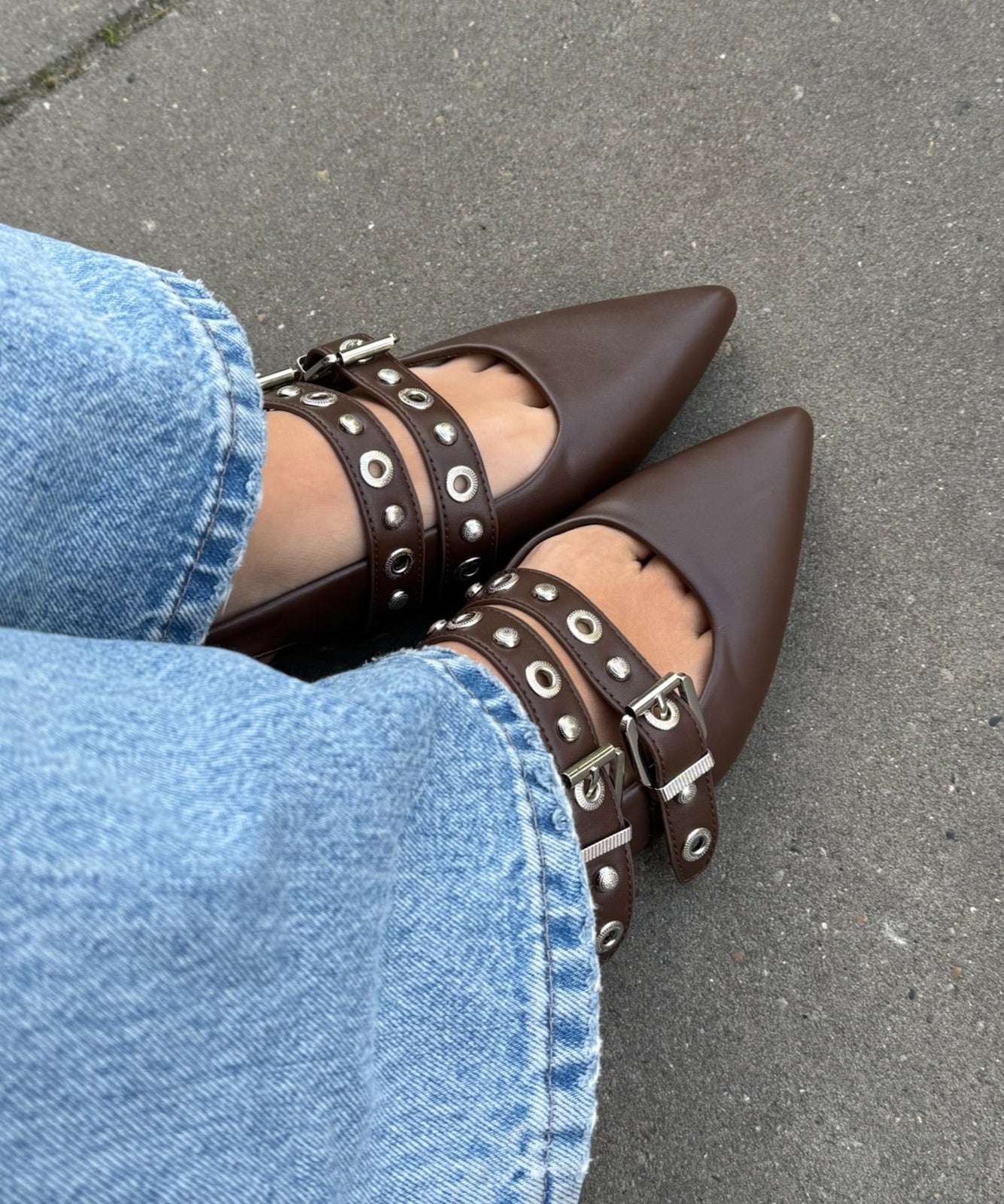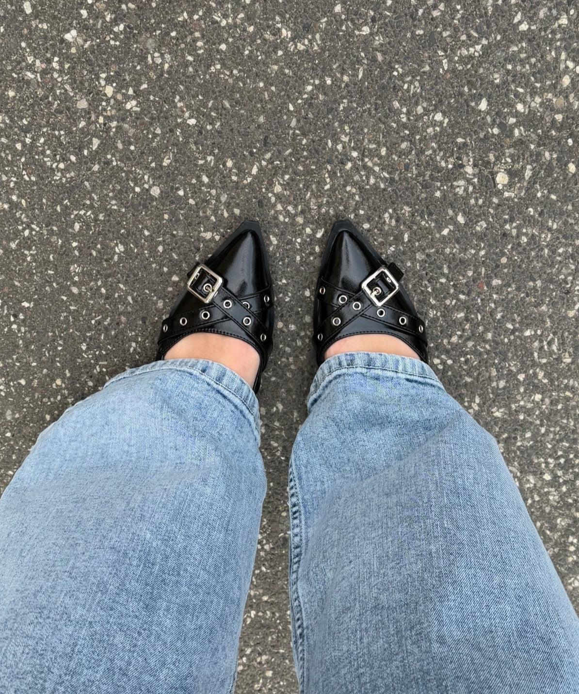Vores Zara Slingbacks er et par flade slingbacks med justerbar rem og to chunky spænder. De er perfekte til en bytur, men med deres komfortable fit og stilet look, kan de også pifte hverdags outfittet op🖤⚡️
