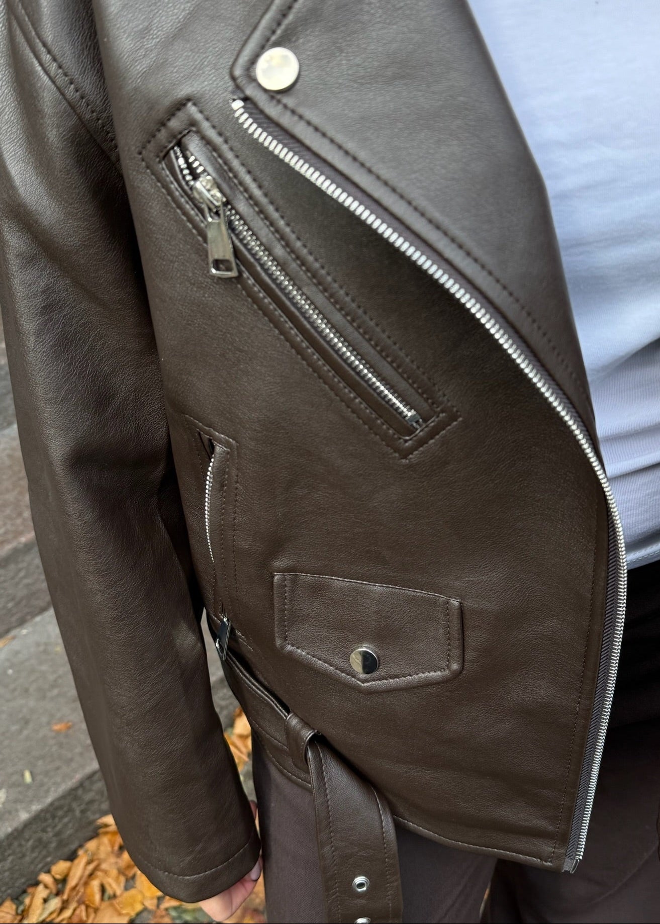 Vores læderjakke er klassisk og stilren; et musthave i garderoben. Jakken har et bælte ved taljen, lynlåslukning, krave og tre lommer. Den kan eventuelt styles med vores Chunky Strik til de koldere dage🍂🤎