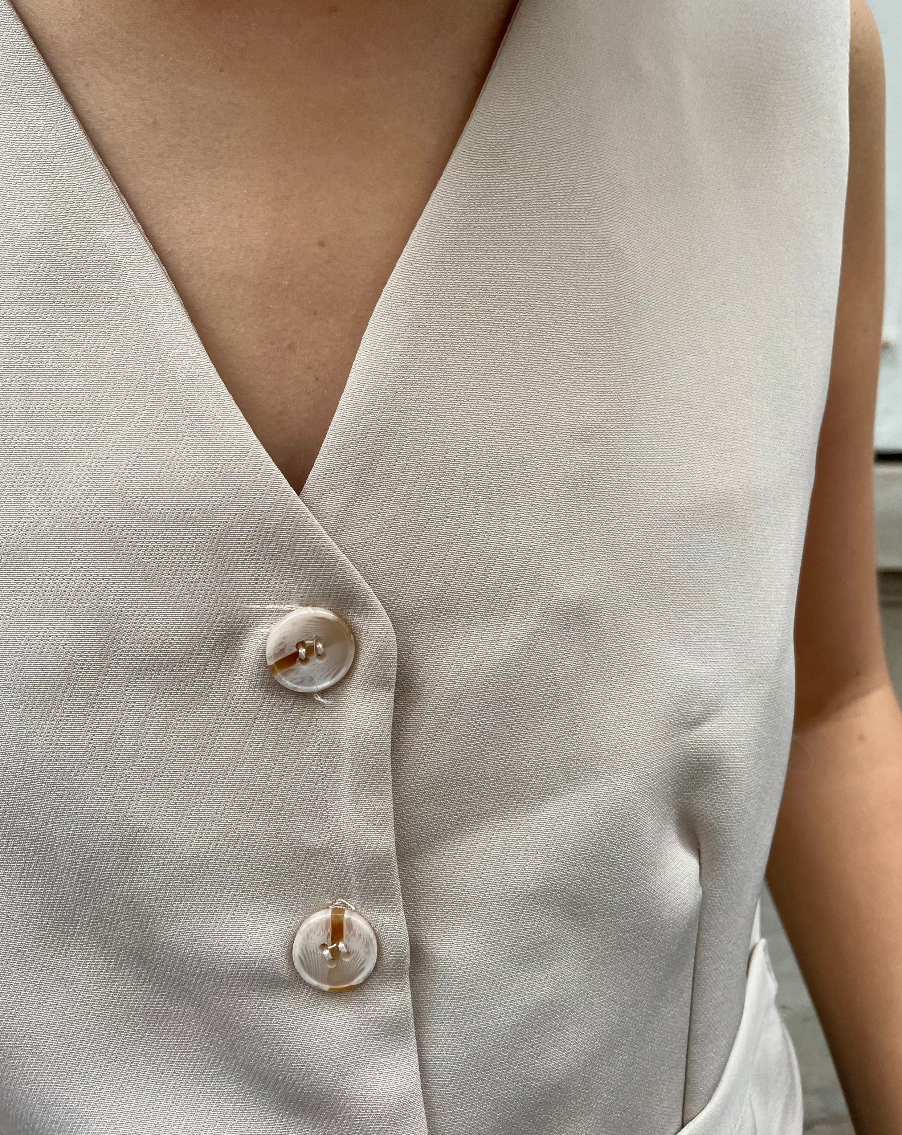 Vores Basic Vest er perfekt til et stilet look til en bytur eller fest. Vesten har fine detaljer og knapper, så den kan åbnes helt op. Vesten kan styles med bare arme eller og en t-shirt sammen med et par jeans eller med vores populære hørbukser🤎