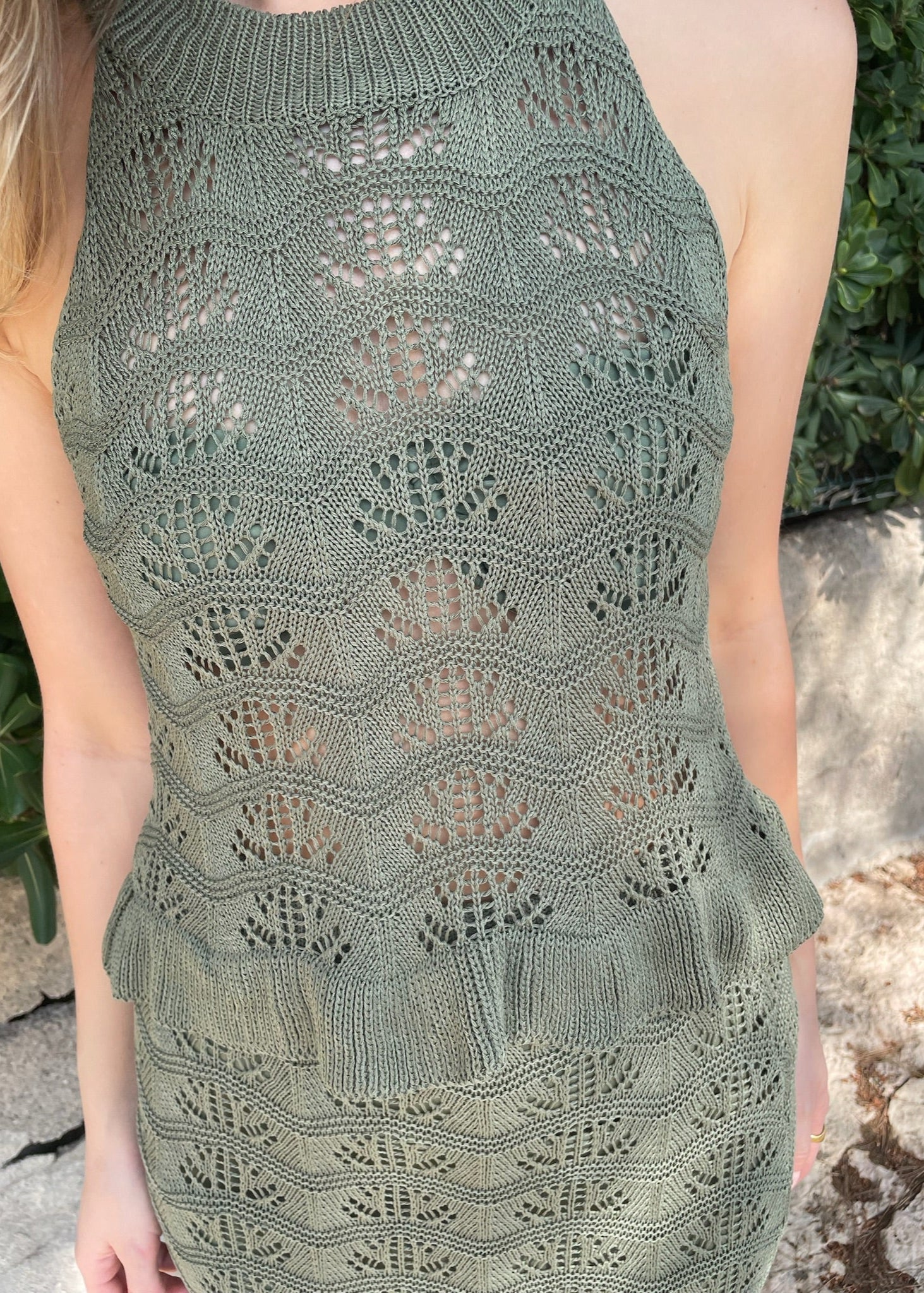 Vores Fanny Strik Sæt består af en ærmeløs, letstrikket top med rund hals og rynket bund. Den matchende lange nederdel har en tætsiddende pasform og et elegant, flowy fald. Det perfekte sommersæt!🌸