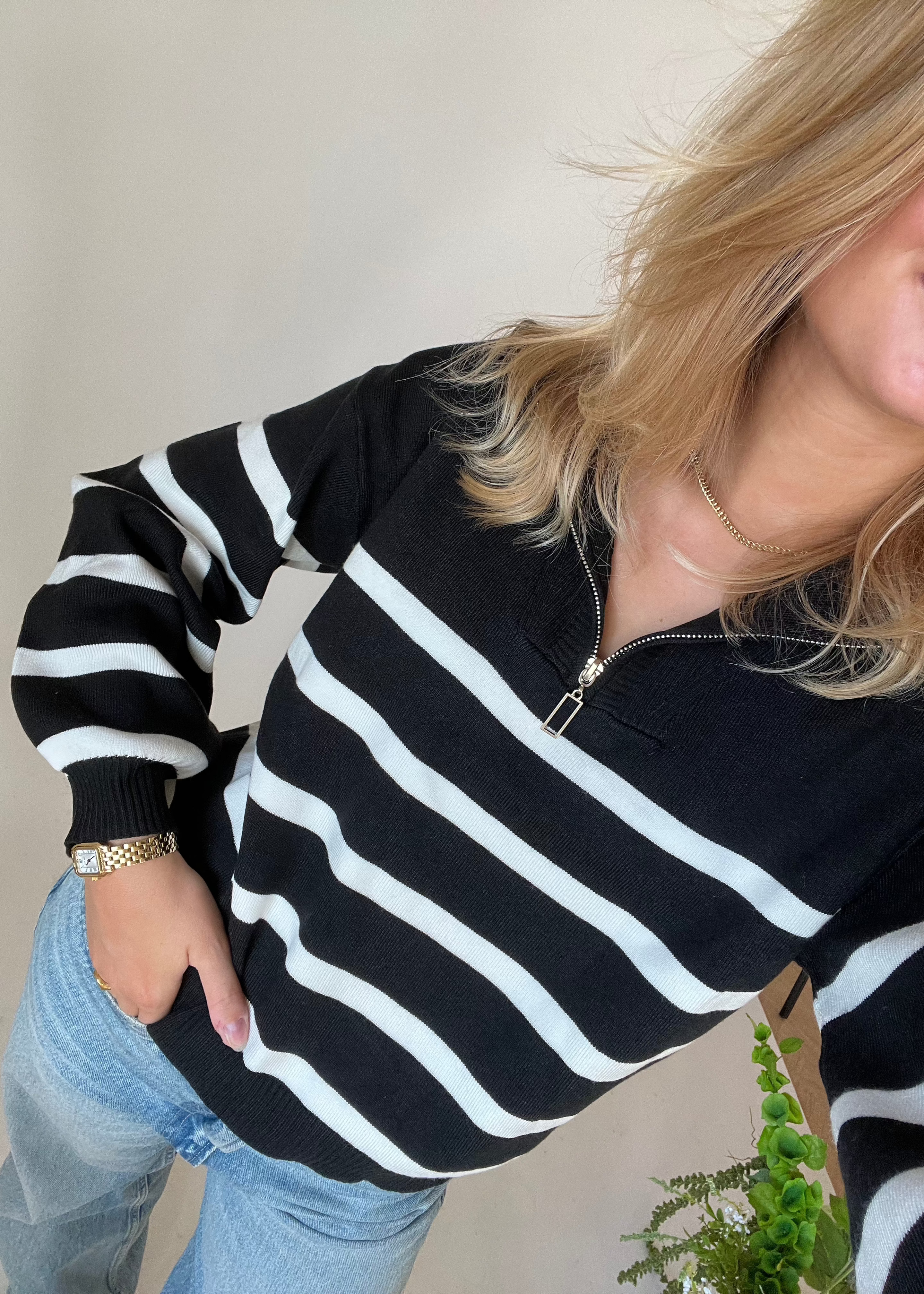 Vores Half Zip Strik er en stilfuld stribet strik med høj hals og half zip. Derudover har den de fineste små ballonærmer og et materiale, der føles blød og varm på huden. Denne strik er perfekt til efteråret!💘🧸