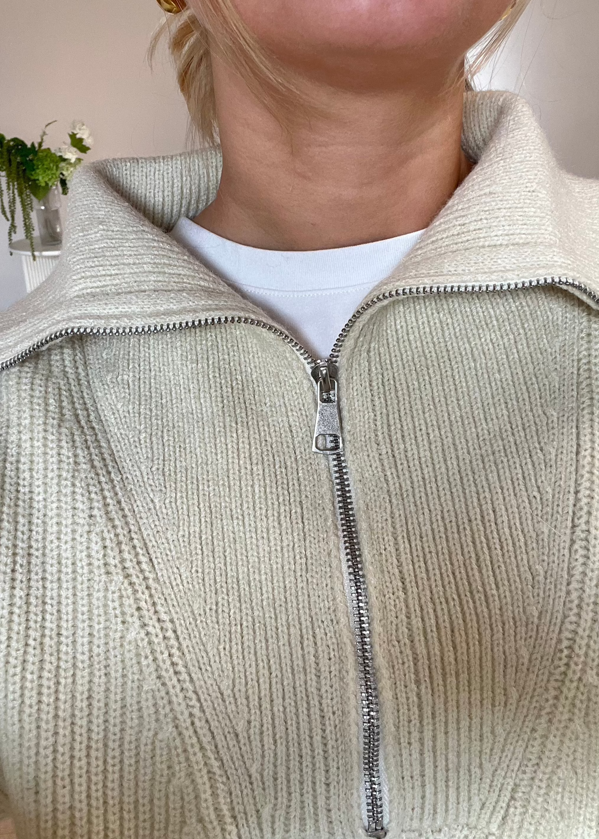 Vores Olivia Half Zip Strik har en polokrave og en lynlås foran, som stopper omkring midt på brystet. Strikken er blød og har lange opsmøgede ærmer. Denne strik er stilfuld og går til mange outfits! 💕