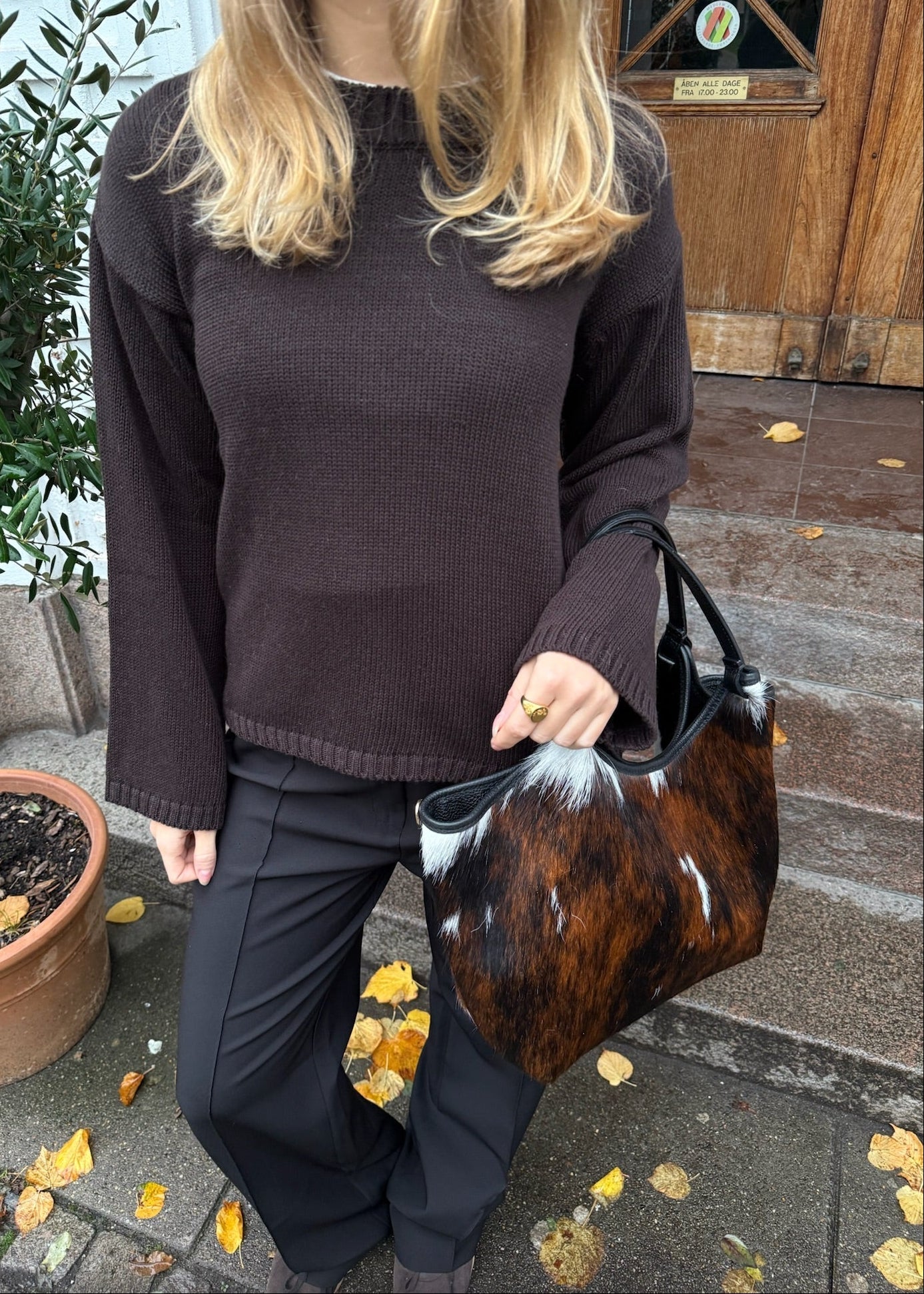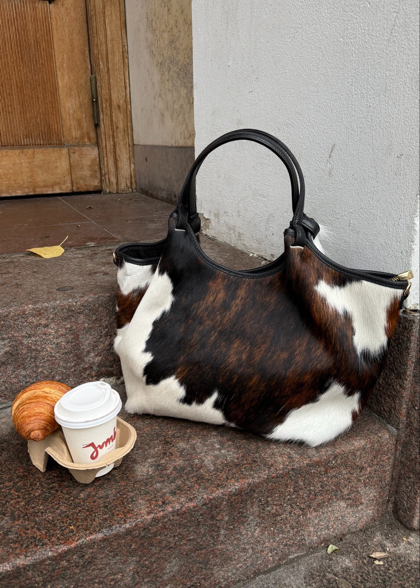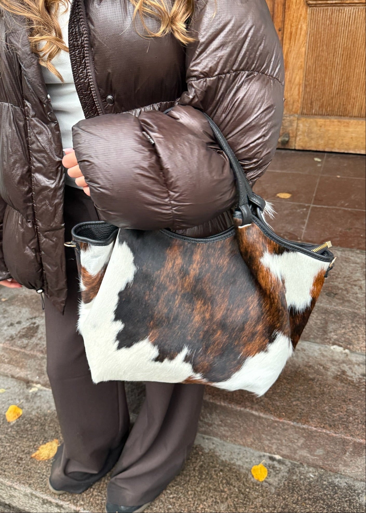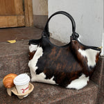 Cow Tasken er en stilfuld og trendy skuldertaske lavet i ægte læder og med koskind. Tasken har plads til en 13-tommer computer. Tasken har et stort rummeligt rum med håndtag, som bæres på skuldrene🤎