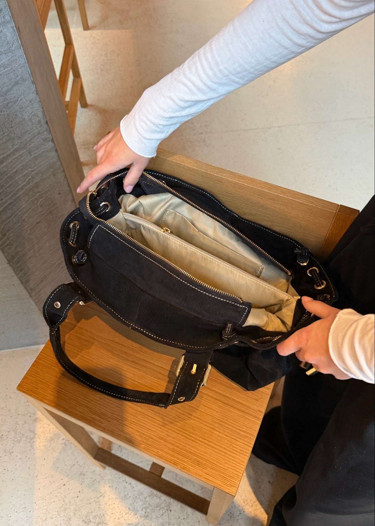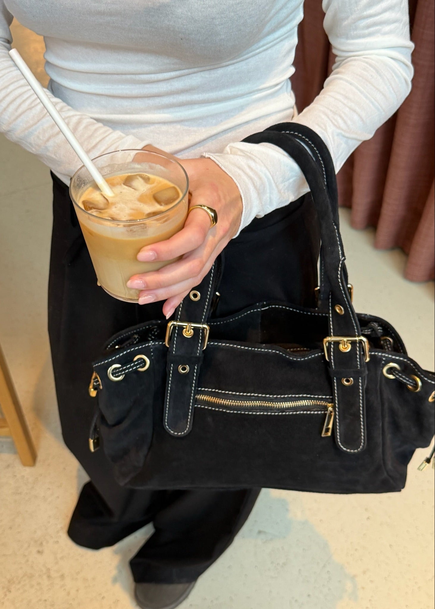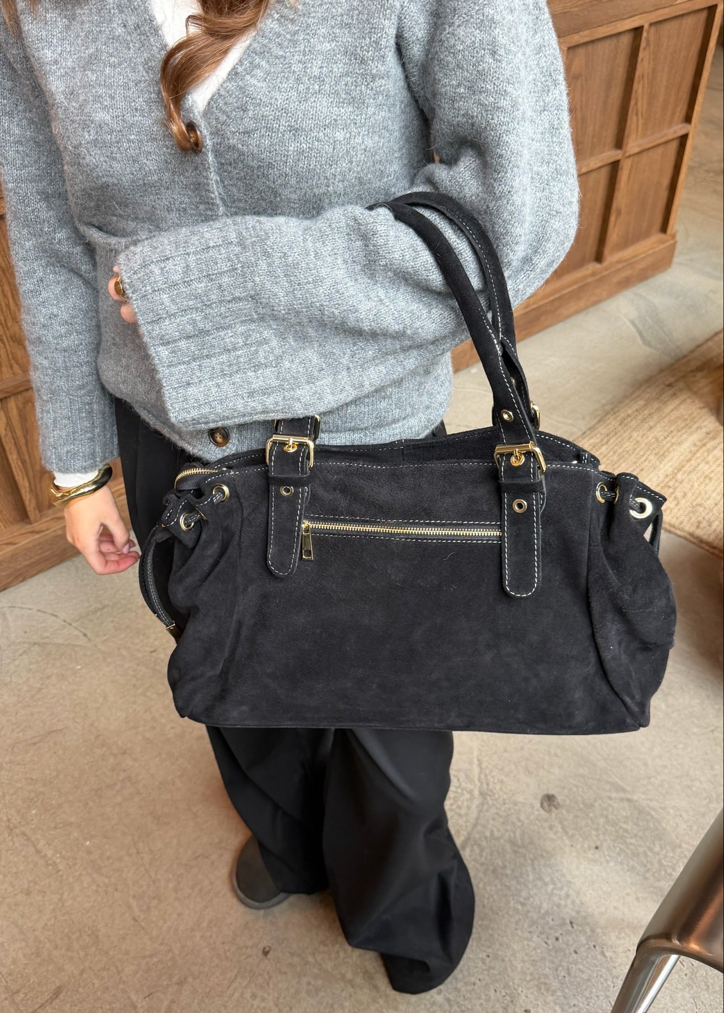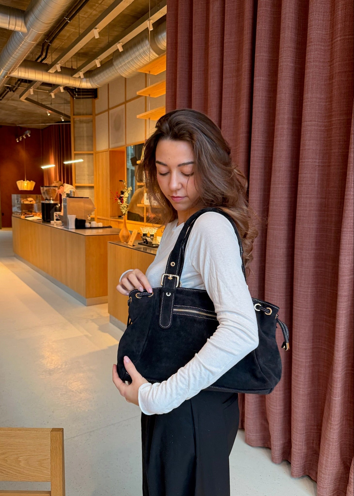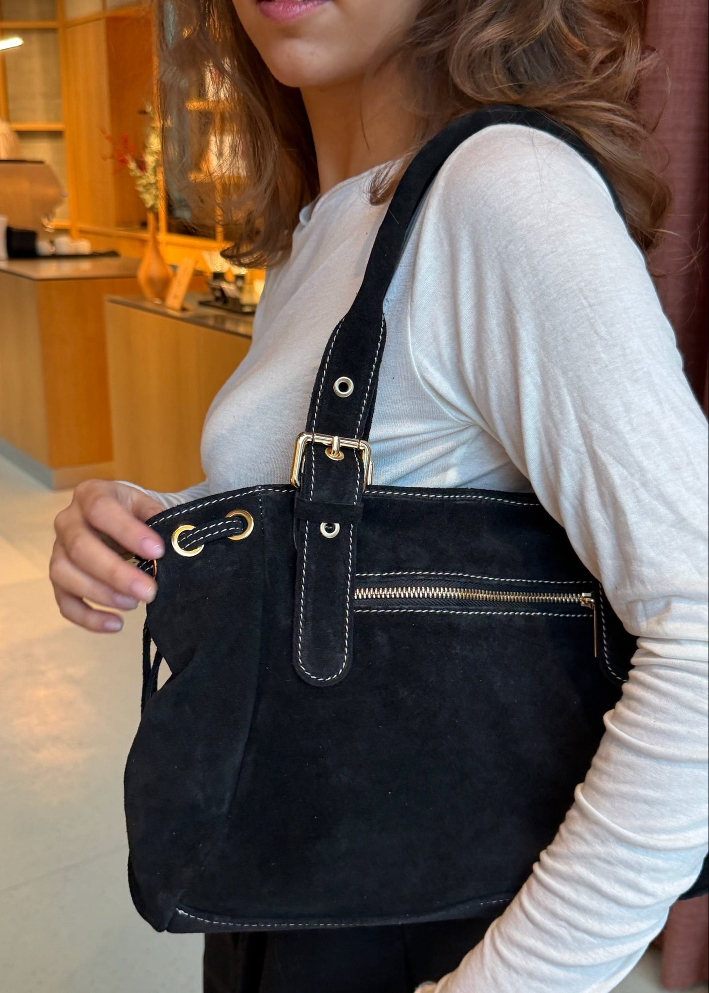 London Tasken i Ruskind er en elegant skuldertaske fremstillet i 100 % ægte ruskind 🤎💫 Tasken har justerbare stropper og kan strammes ind i siderne, så formen nemt kan tilpasses efter behov.