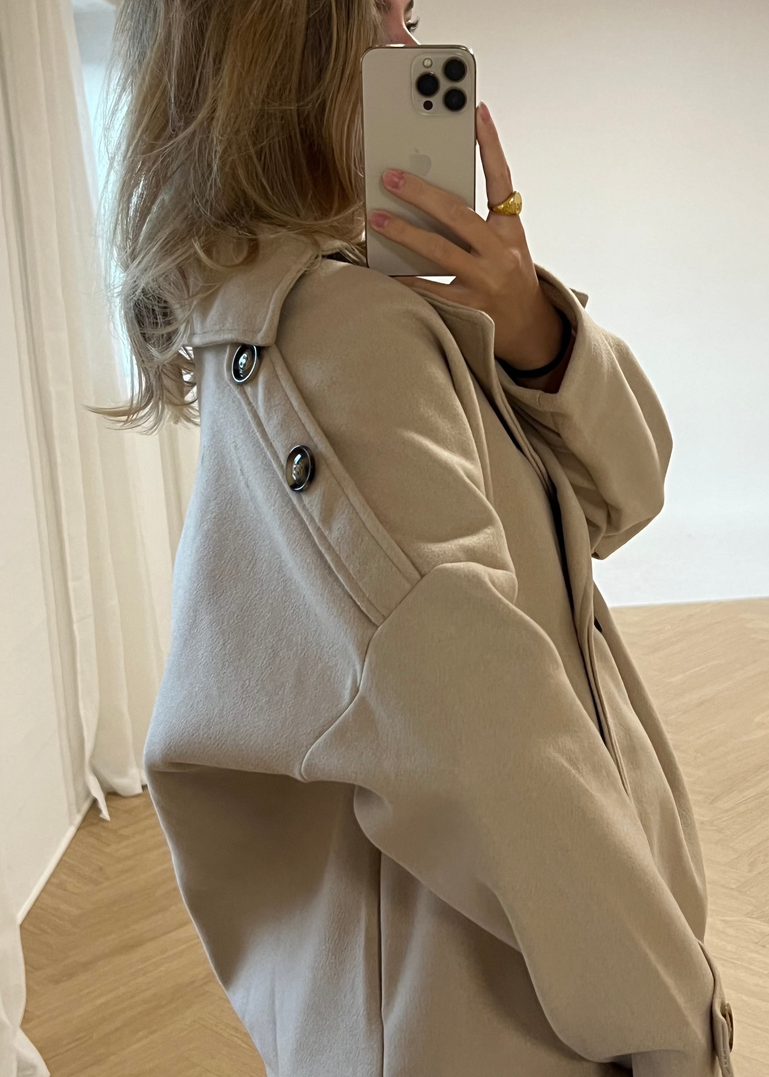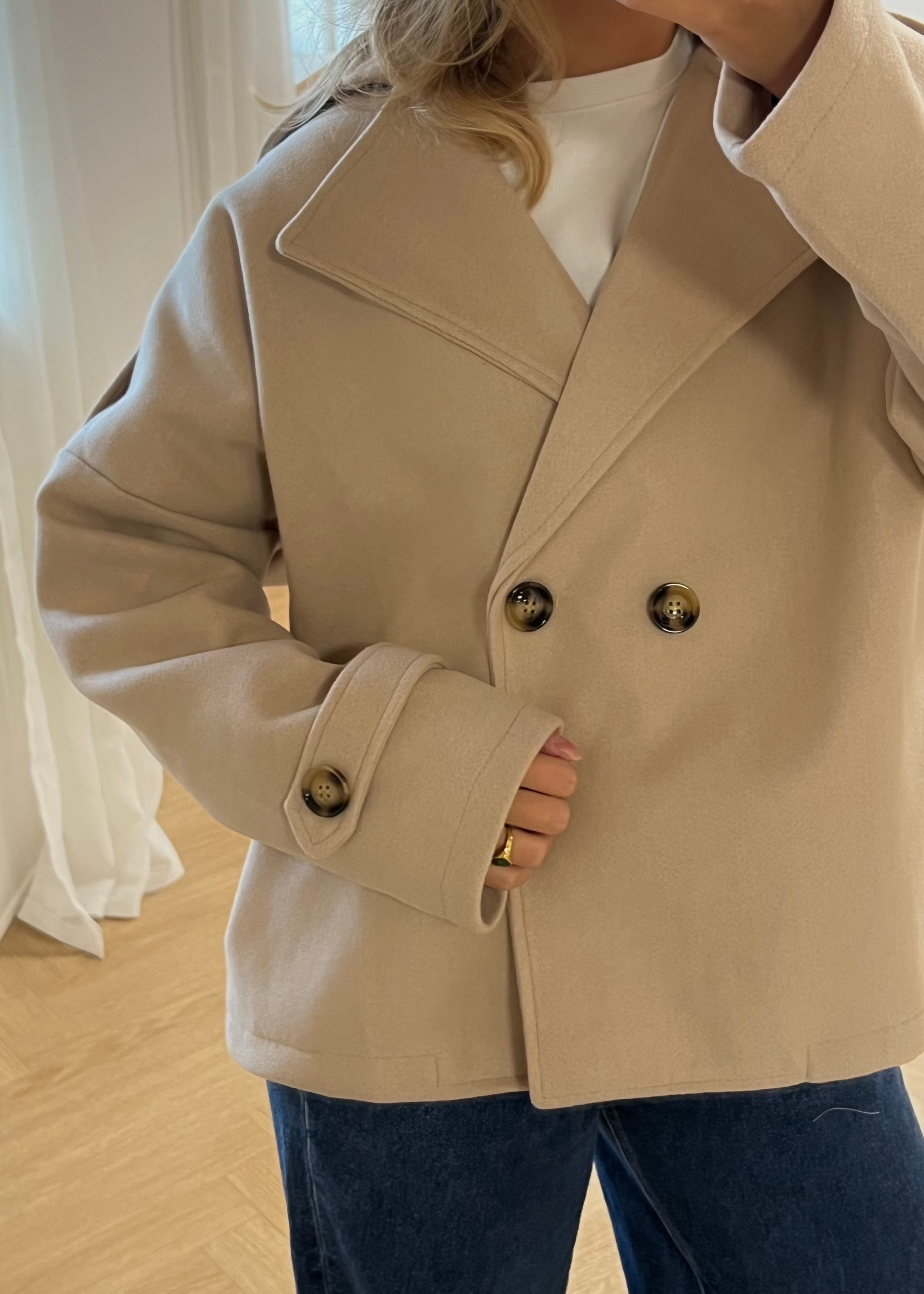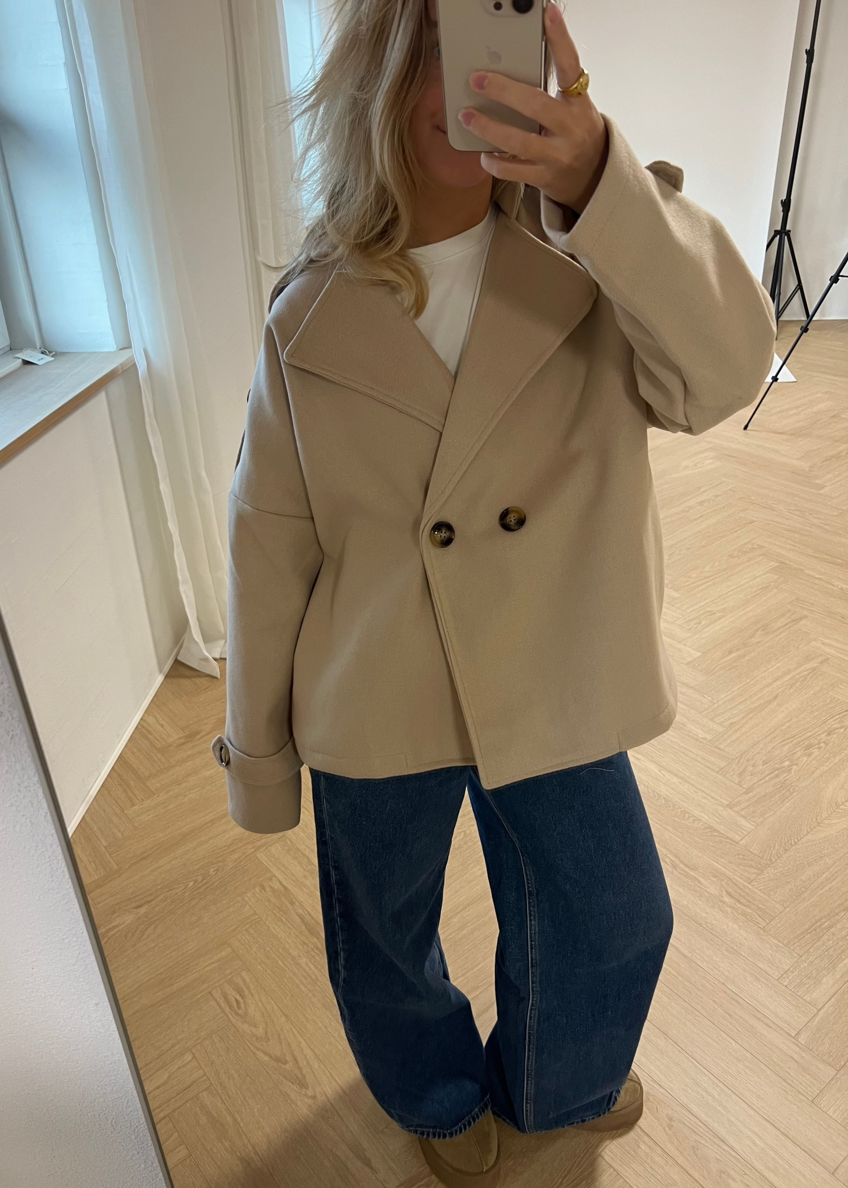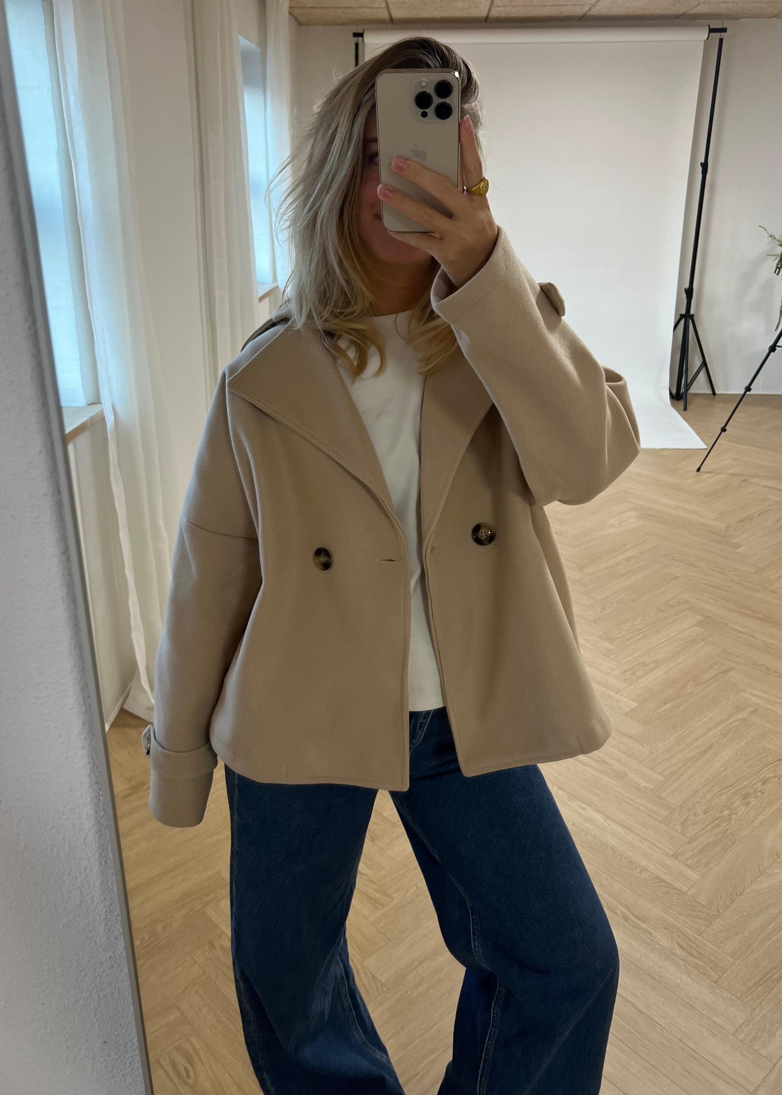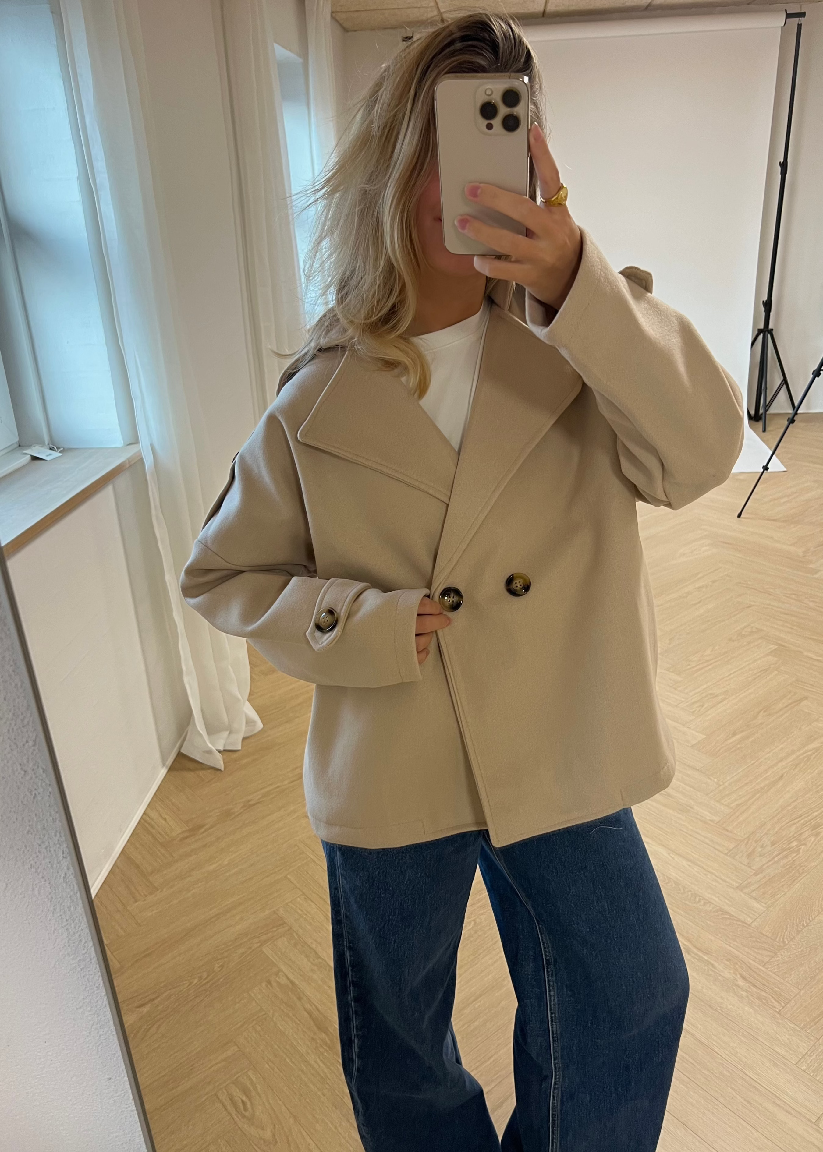 Vores Minna Jakke har en løs og komfortabel pasform i en tidløs beige farve. Den lukkes med elegante brune knapper, der giver et sofistikeret touch. Jakken har lange ærmer med strop og knapdetalje ved håndleddene, hvilket tilføjer et ekstra flair til designet💫✨