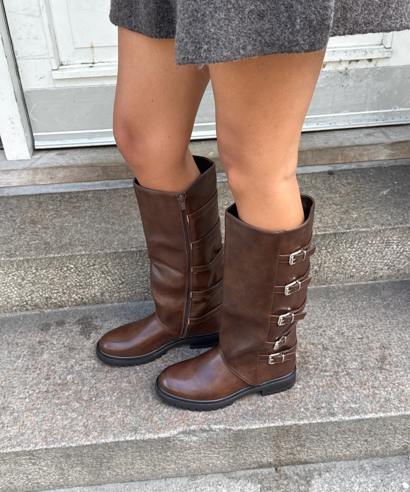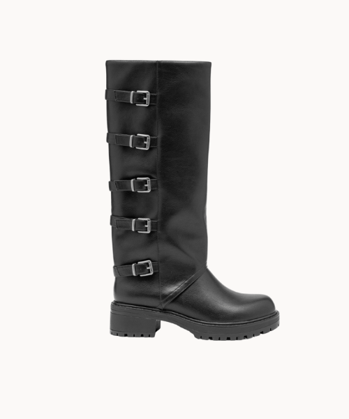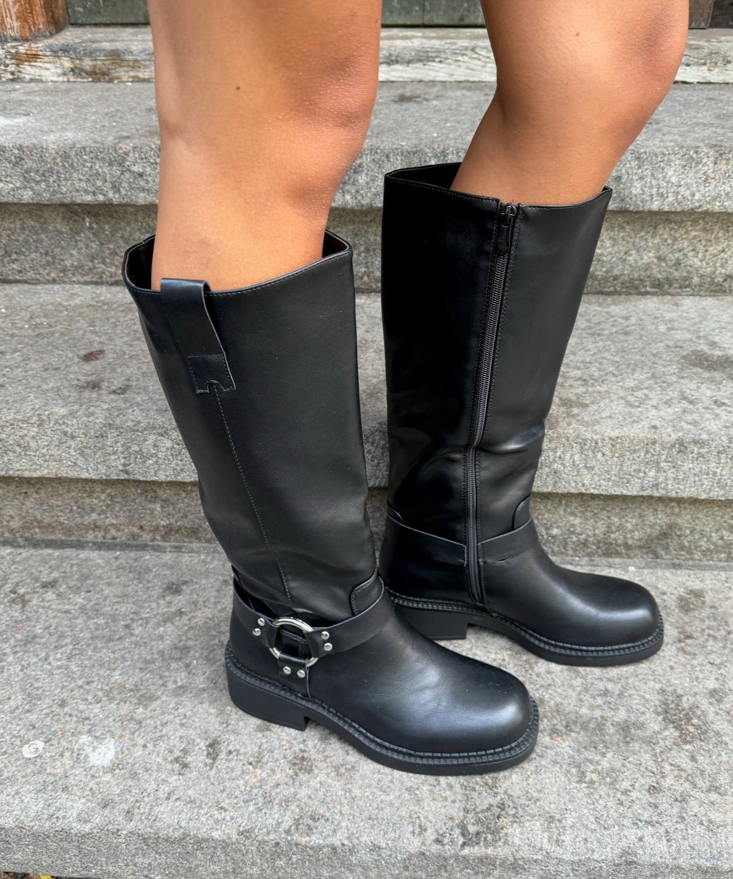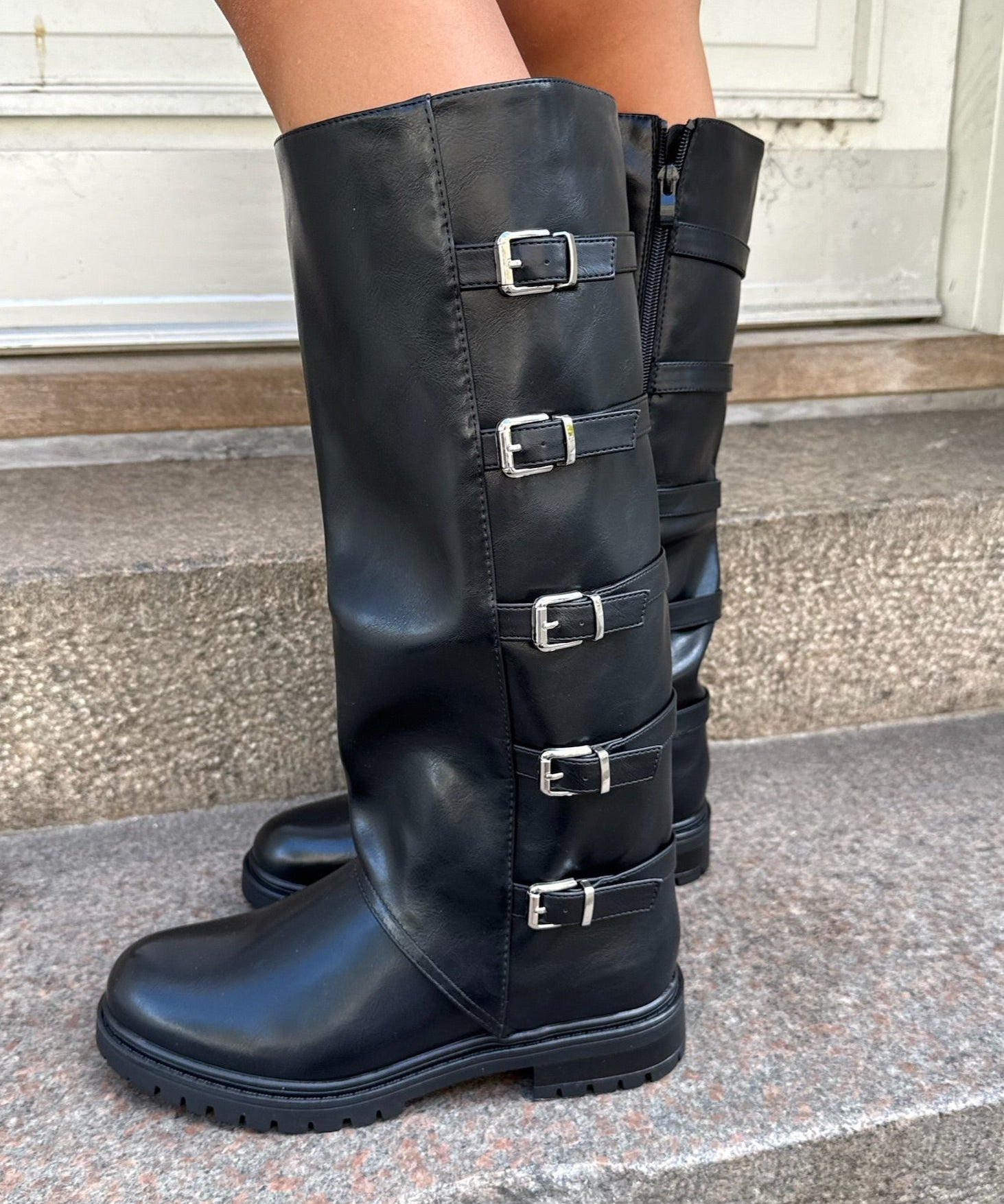 Vores nye Buckle støvler er en mellemhøj støvle i imiteret læder med mat finish. De har et enkelt, lige skaft med lynlås bagpå, som gør dem nemme at tage af og på. Den metalliske spænde og nittedetaljer giver støvlen et råt og stilrent udtryk, der passer perfekt til efteråret og vinteren. ⭐