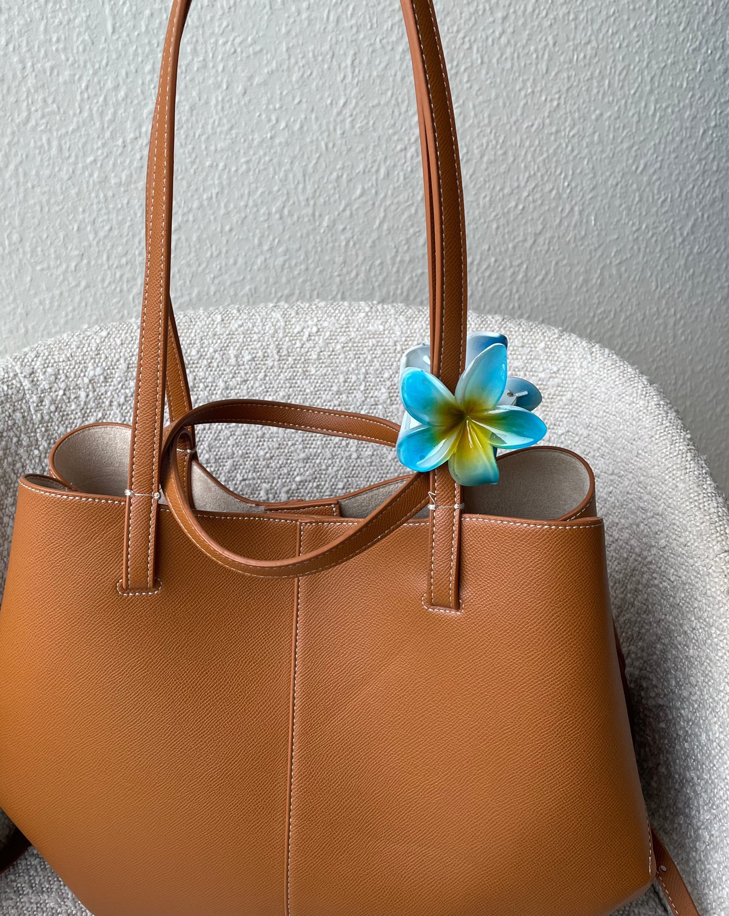 Vores fine og elegante Hawaiiblomst hårklemme er den perfekte accessories til sommeren. Den kan bæres i håret som en hårklemme eller omkring håndtaget på en af vores finde tasker🌸