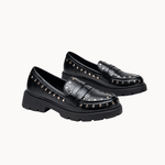 Vores nye Aria Loafers med Nitter er lavet i imiteret læder med dekorative nitter og en markeret, rillet sål. De kombinerer et klassisk loafer-design med et råt twist, der gør dem perfekte til både hverdag og byture✨