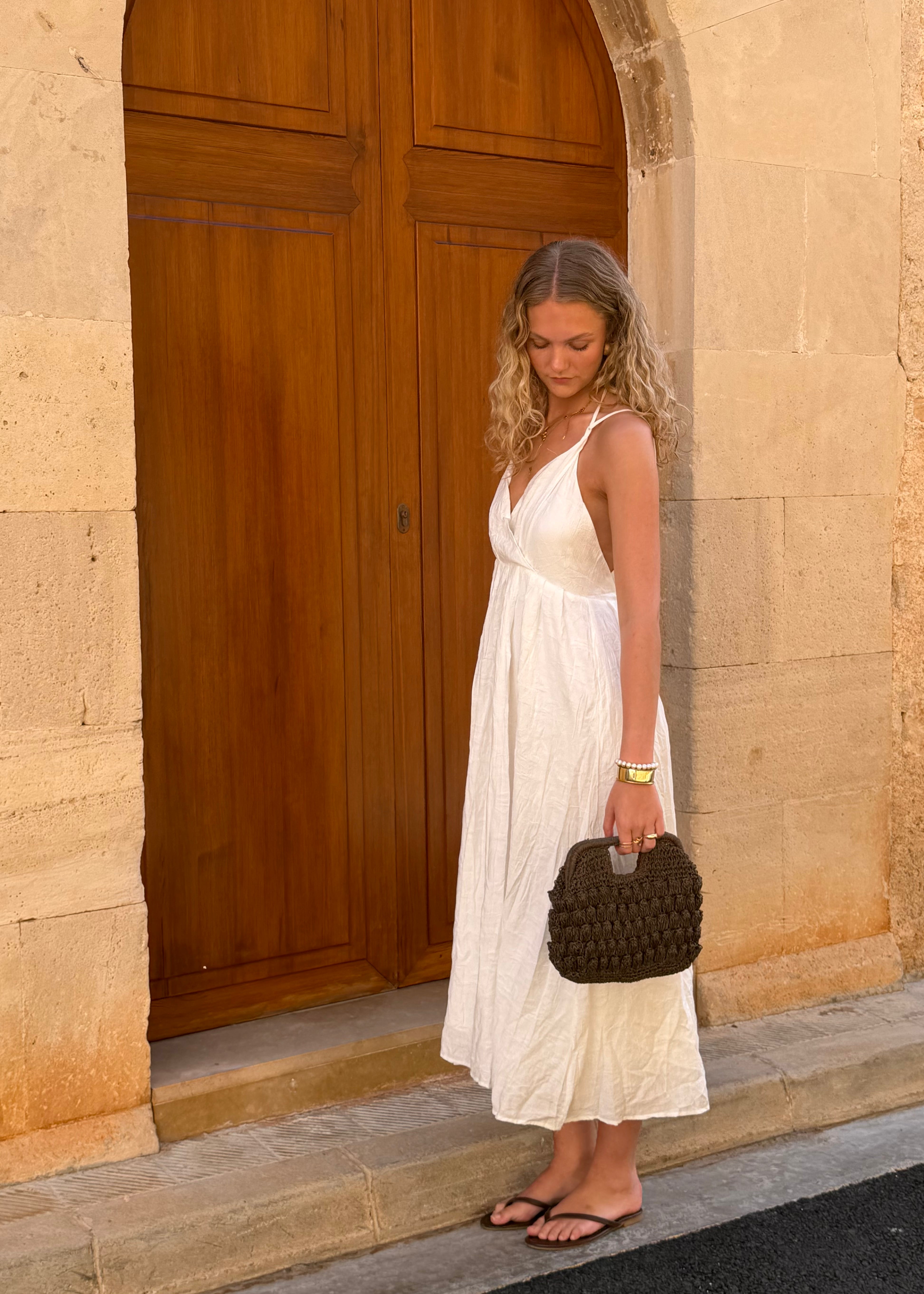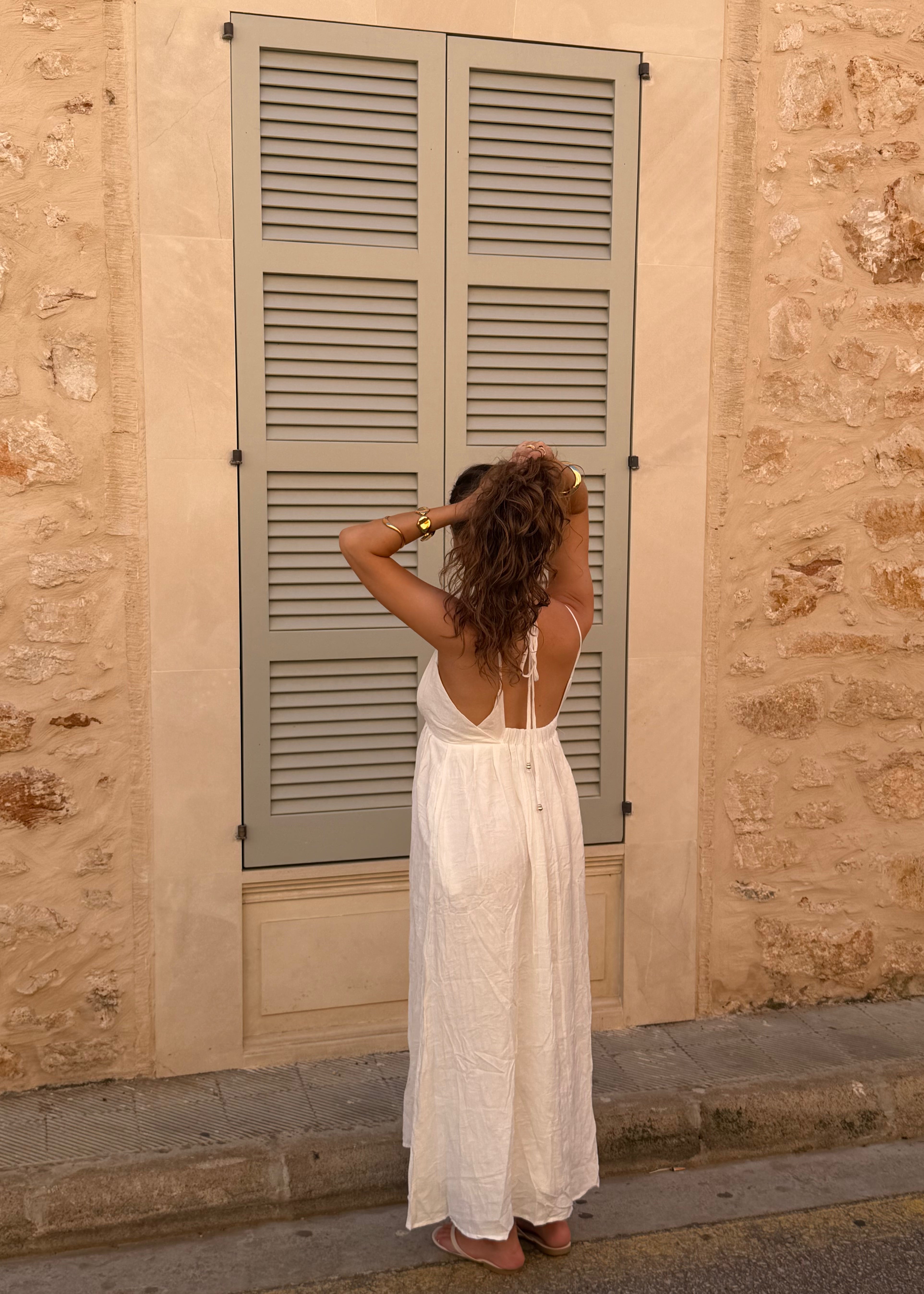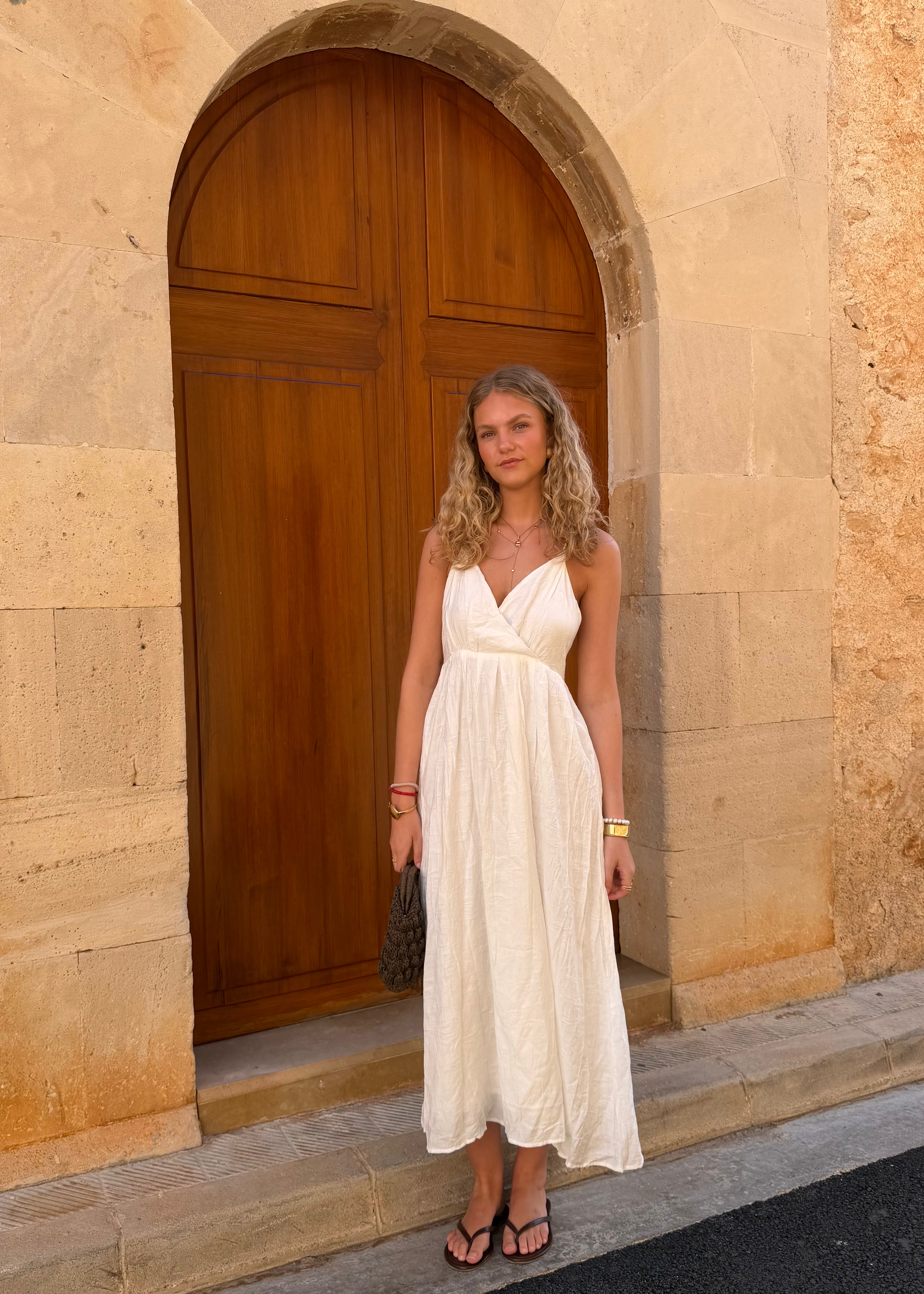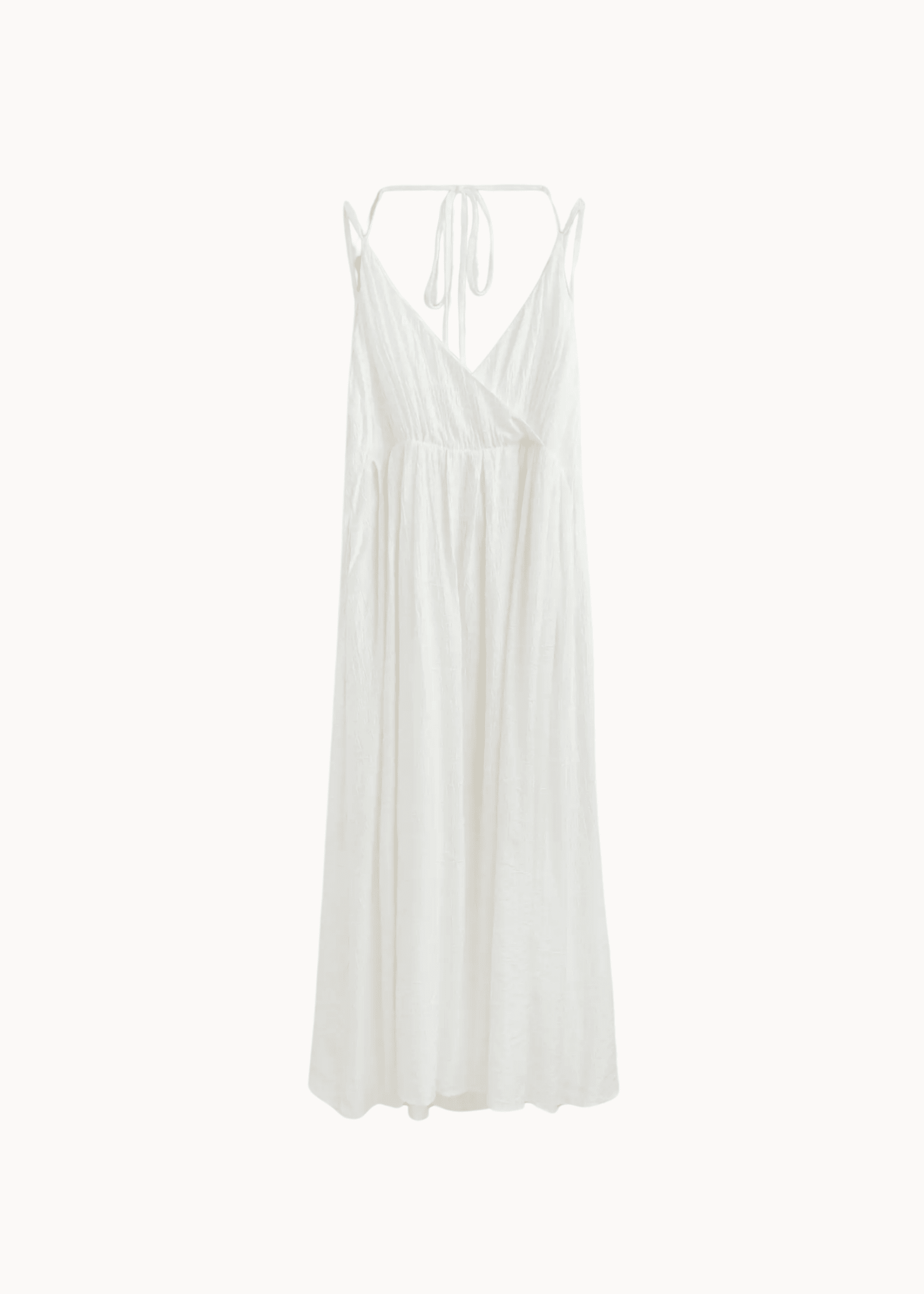 Lang kjole uden ærmer i et let tekstureret materiale med en smuk, krydset V-udskæring. Den rynkede talje fremhæver silhuetten, mens den åbne ryg og fine bindebånd i nakken giver et elegant og feminint udtryk 🤍