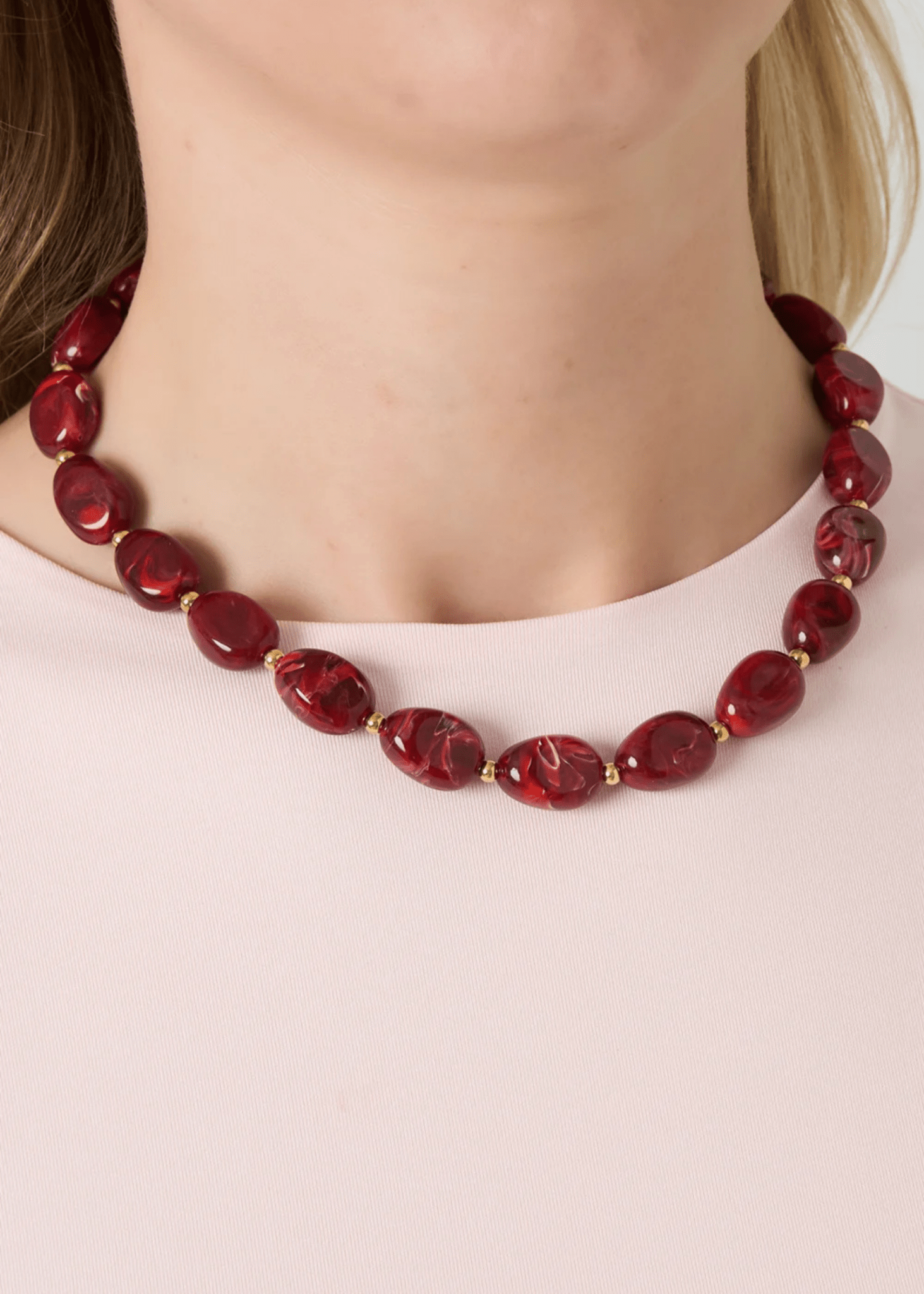 Vores Nani Chunky Perle Halskæde er en klassisk og elegant halskæde med store, glansfulde røde perler med mindre gul perler. Halskæden giver et tidløst, men markant udtryk, der løfter ethvert outfit - perfekt både til hverdag og fest.