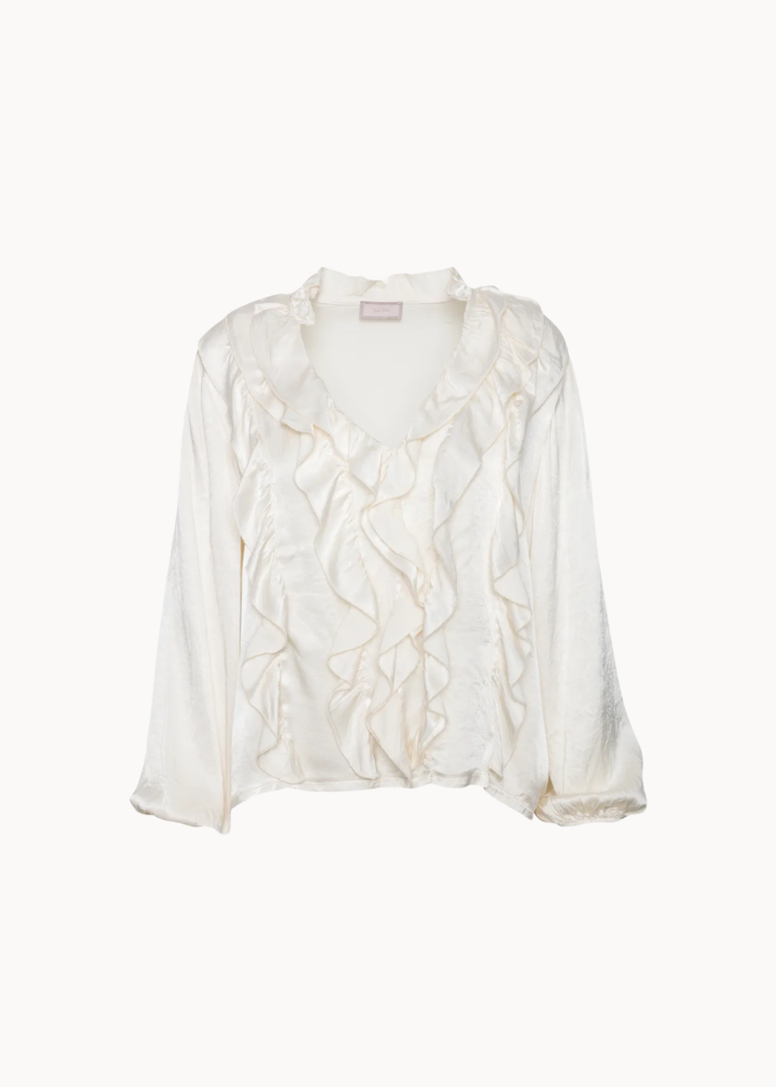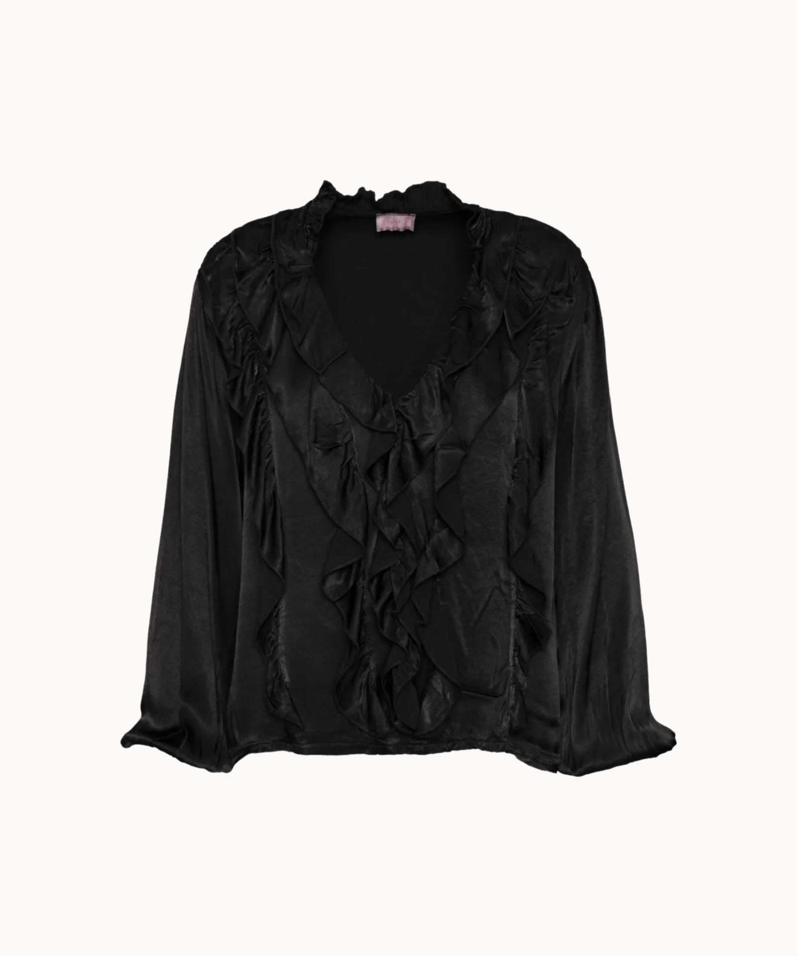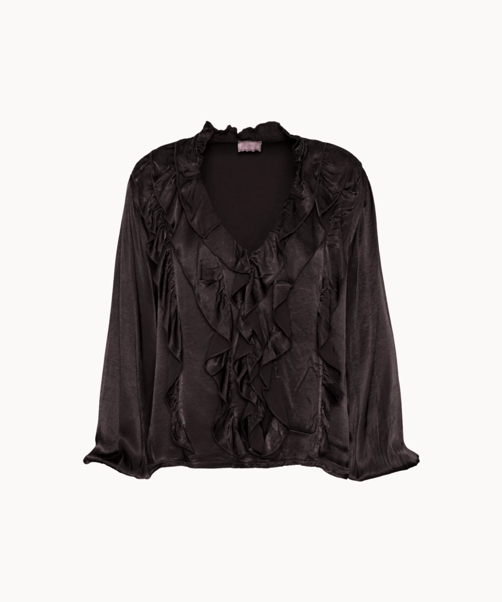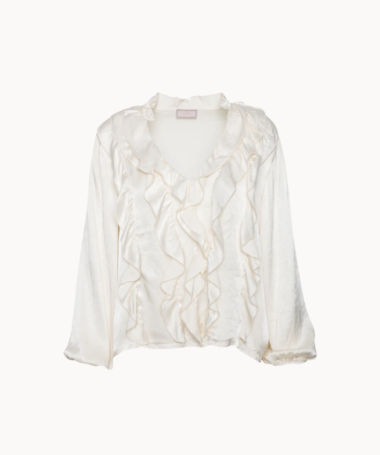Vores Ruffle Satin Bluse er en elegant og feminin bluse, der kombinerer klassisk charme med et moderne touch. Den er designet i et glansfuldt satin-lignende materiale, der falder smukt på kroppen. De fine flæsedetaljer foran og ved udskæringen giver et romantisk og eksklusivt udtryk, mens de lange, let løse ærmer tilfører et sofistikeret look. Perfekt til både festlige anledninger og hverdage, hvor du vil tilføje lidt ekstra elegance✨